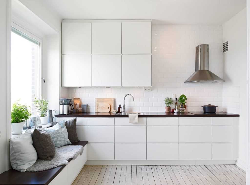 Белый цвет прекрасно подойдет для обустройства маленькой кухни, так как он визуально увеличит помещение, сделает его более просторным и наполненным светом.