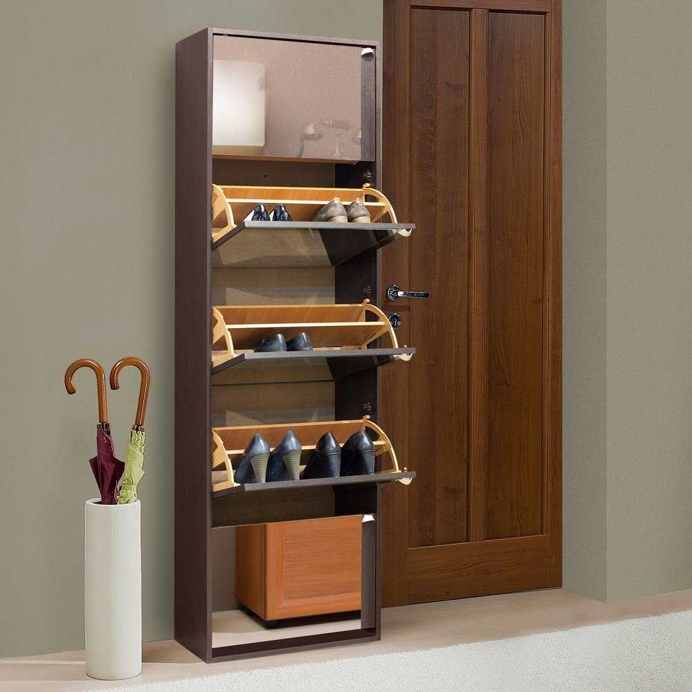 — Специальной узкой открытой стойки или закрытой тумбы-обувницы с наклонными полочками для обуви.