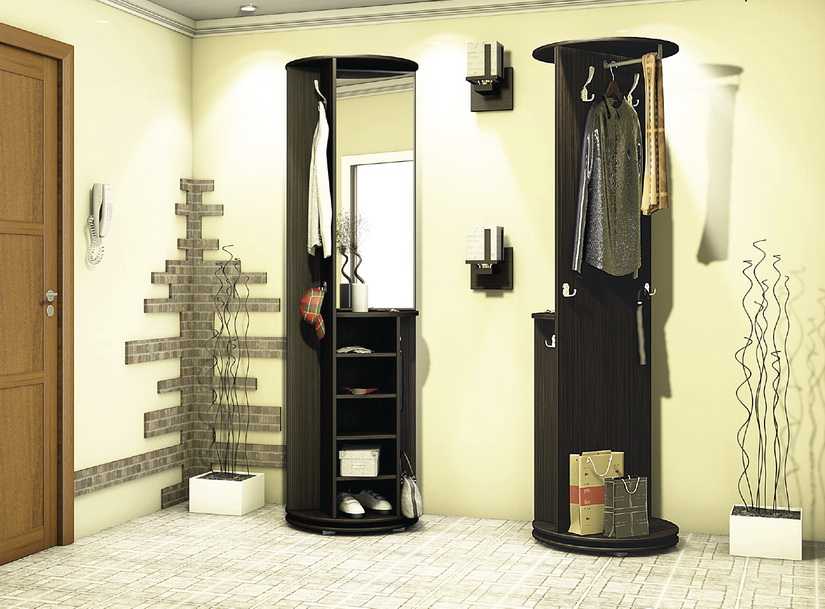 Еще один вариант — использовать трансформируемые виды мебели, например, поворотную модель. С одной стороны размещается зеркало, которое также служит дверкой шкафа, под ним организованы полки для небольших вещей. По бокам модуля есть углубления с крючками, а на обратной стороне находится поперечная штанга для одежды среднего размера.