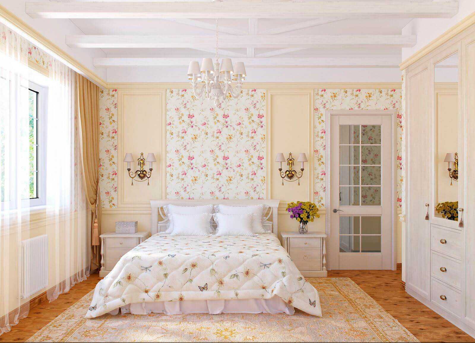 - Спальня в стиле прованс — место, где обитают романтика и нежность. Отличительные черты — теплые пастельные оттенки, цветочные орнаменты, натуральные отделочные материалы, старинная (или состаренная) мебель, большое количество декора.
