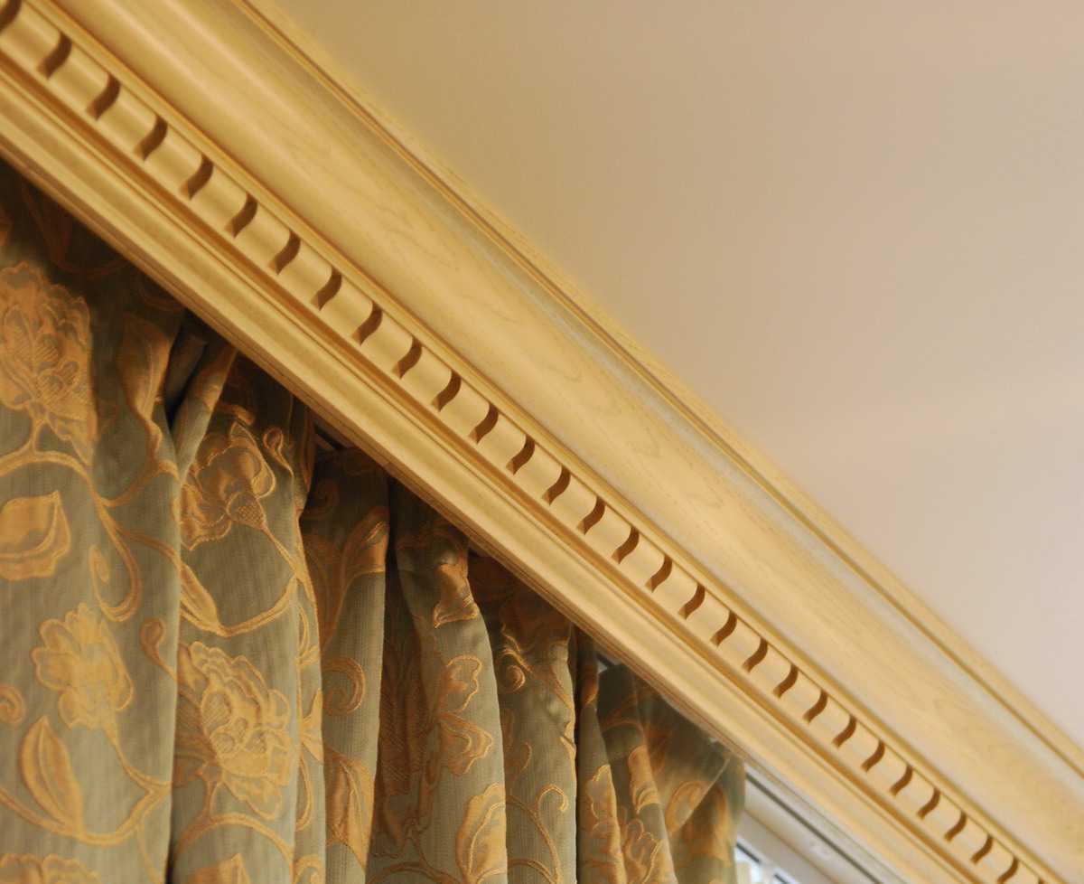 Главная «изюминка» этого изделия – это орнамент на багете. Имитация под дерево и узоры в классическом помпезном стиле будут гармонично смотреться с трехрядной композицией тюля, портьера, ламберкена.