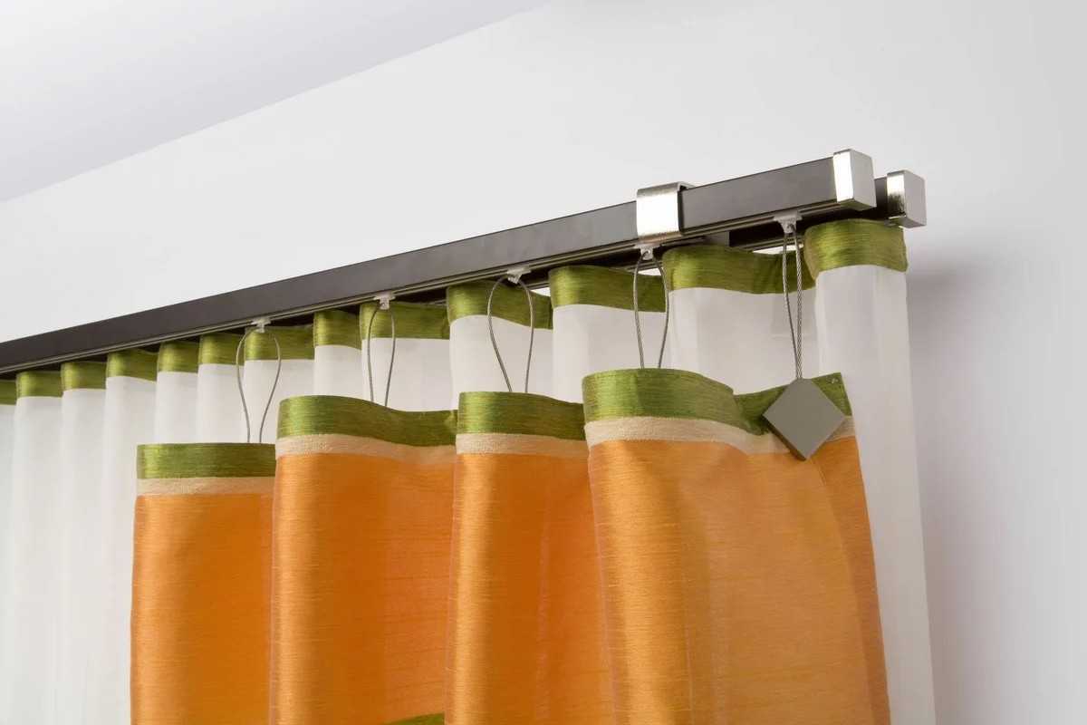 - Профильные, представляющие собой пустотелую металлическую шину, внутри которой передвигаются специальные подвесы для ткани, оснащенные крючками.