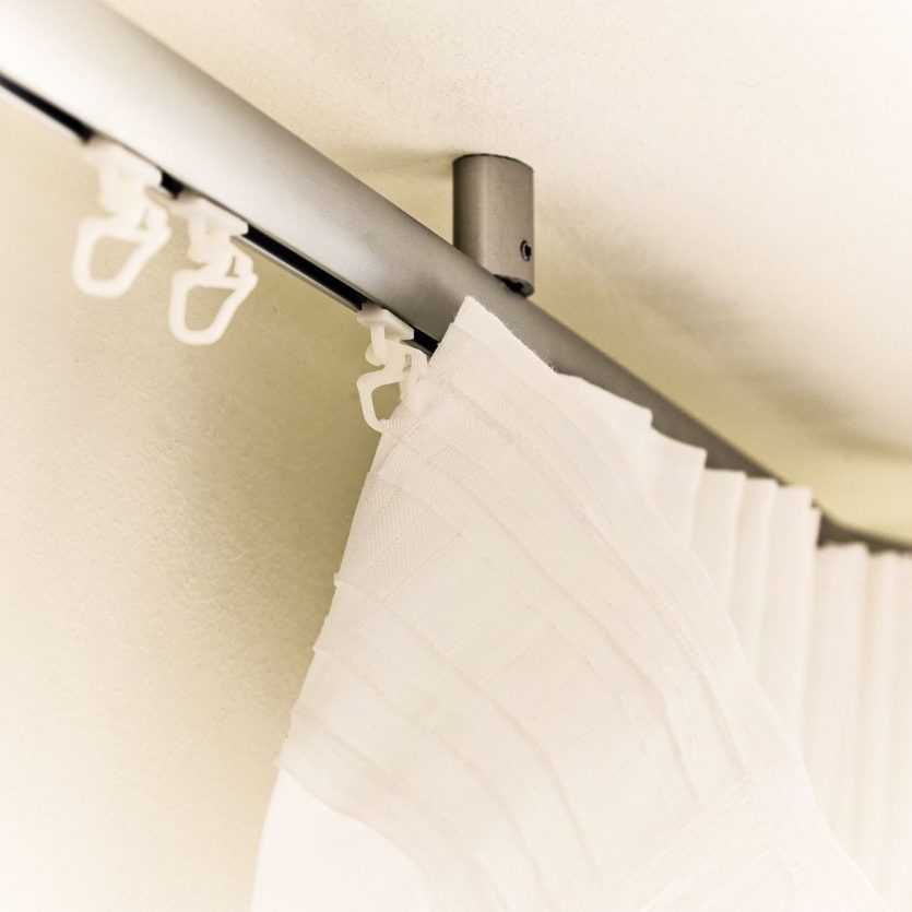 Подобный тип часто монтируют к потолку и делают скрытым. Если крепеж остается видимым, то наружную часть украшают блендой – неширокой декоративной планкой. Правильно установленный профиль из алюминия способен выдерживать любые нагрузки. А пластиковые образцы лучше использовать с невесомыми материями.