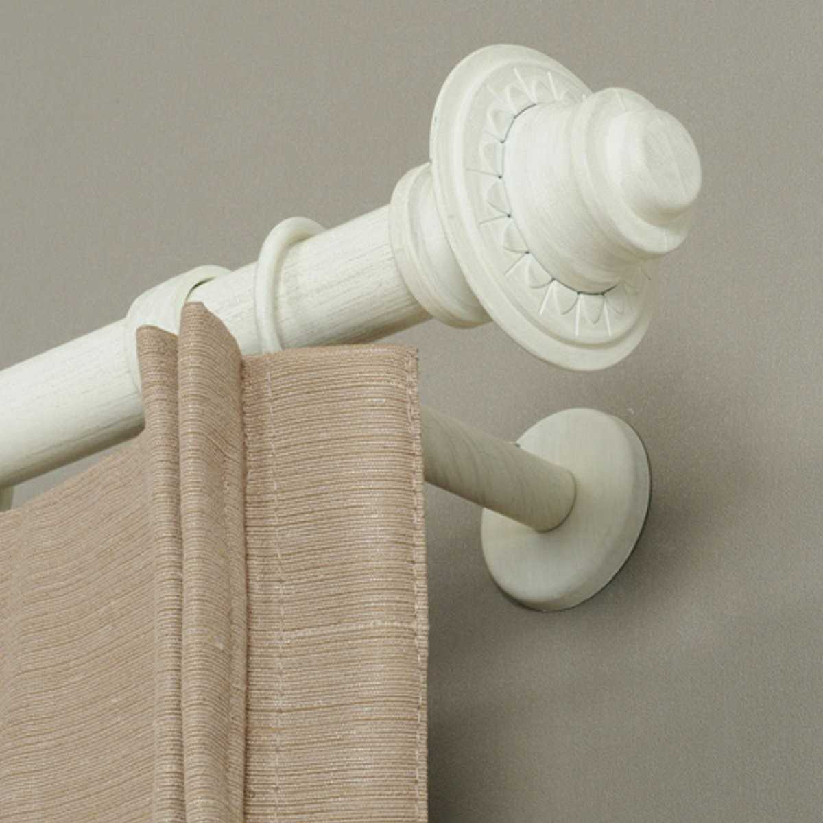 Есть еще такая экзотическая разновидность, как распорный карниз. Он представляет собой круглую штангу и устанавливается между стен. Держится он за счет установленных внутри пружин, которые “выталкивают” концы наружу. На такое крепление нельзя вешать тяжелый текстиль. К тому же перекладина оказывает постоянное давление на стену и способна повредить ее покрытие.