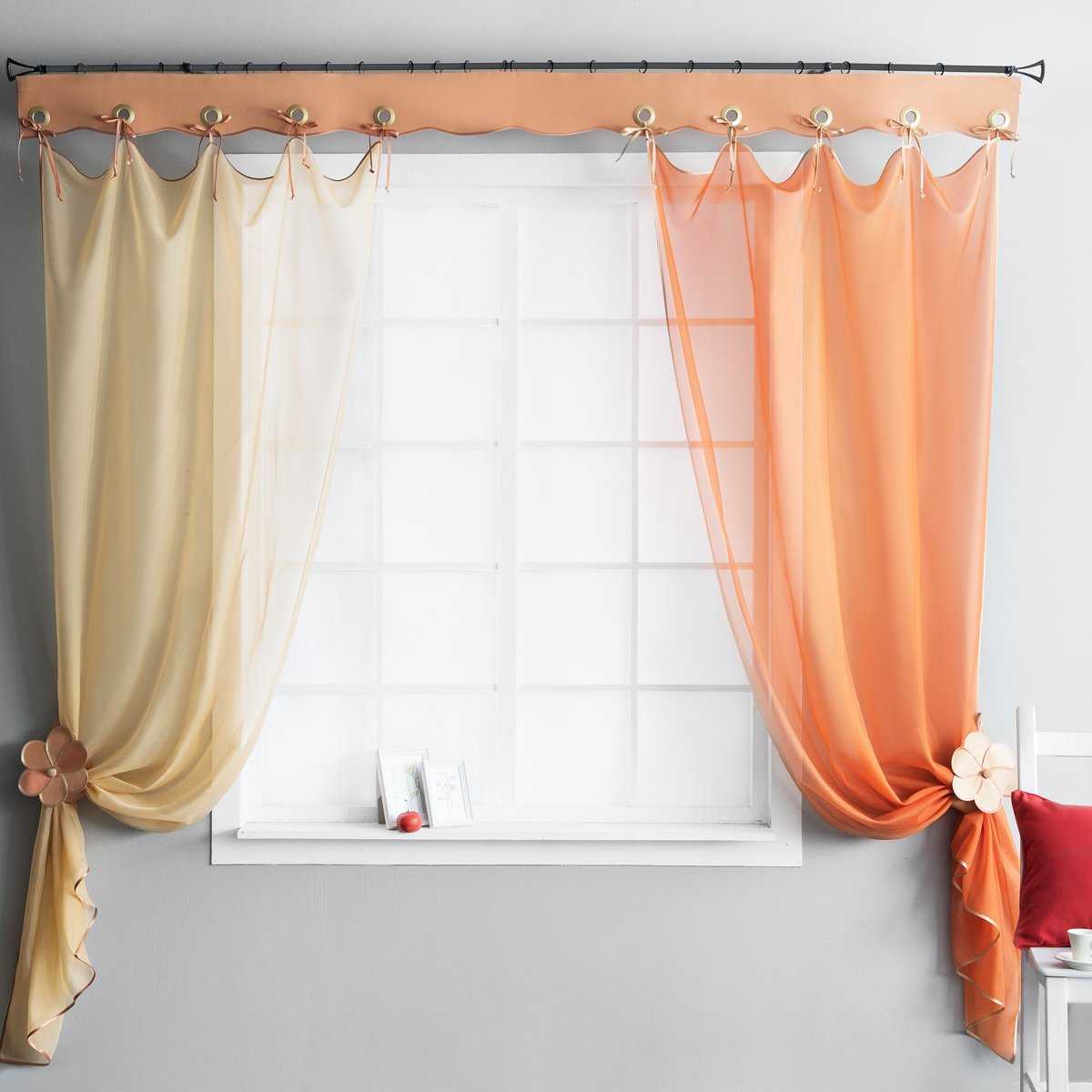 В оформление кухонного окна можно использовать и более плотные гардины из органзы, как дополнение к легким тюлям.