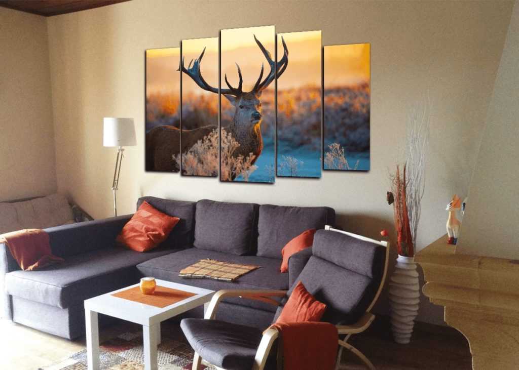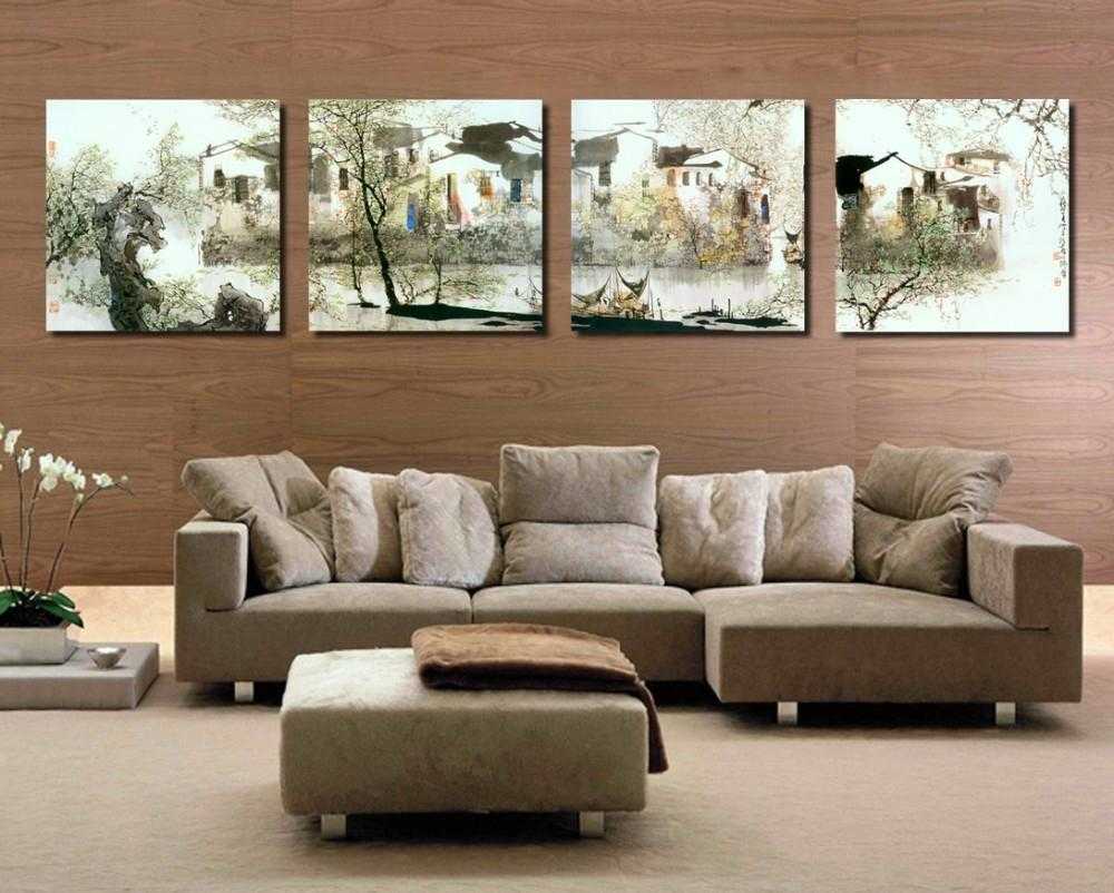 В зависимости от количества сегментов их называют по разному: триптих — 3 секции, диптих — 2 секции. Встречаются и более сложные модели состоящие из 4 и 5 секций — полиптих. Собираются они на стене буквально как пазл. Такое оформление стен в гостиной картинами стоит отдать профессионалам, ведь во многих случаях вся композиция может иметь далеко не прямоугольную форму. Что в целом может затруднить монтаж, поскольку каждое отдельное полотно должно висеть строго вертикально по отношению к другому. А вся картинная композиция строго горизонтально по отношению к полу и потолку.