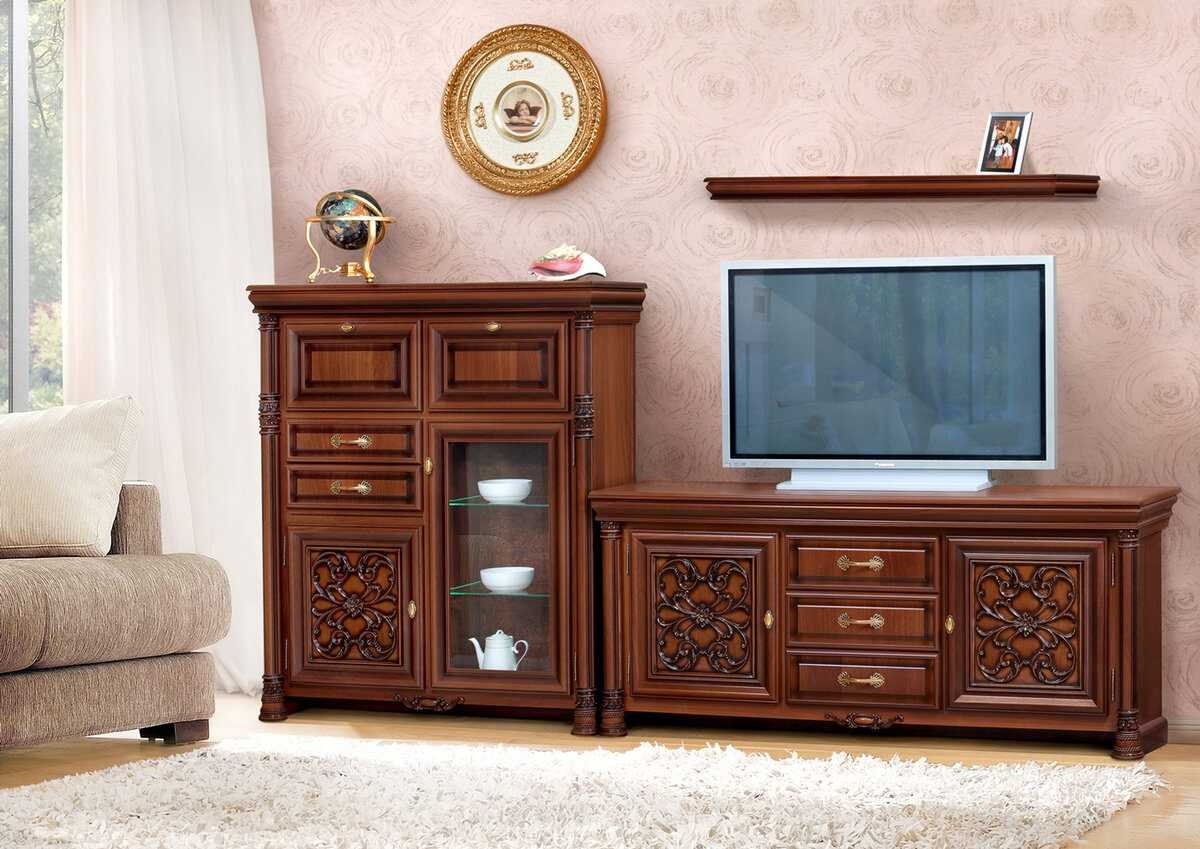 - Гостиная. Модель служит для содержания: альбомов с фотографиями, дисков, документов, книг и др. На столешнице обычно устанавливают видео- и аудиотехнику.