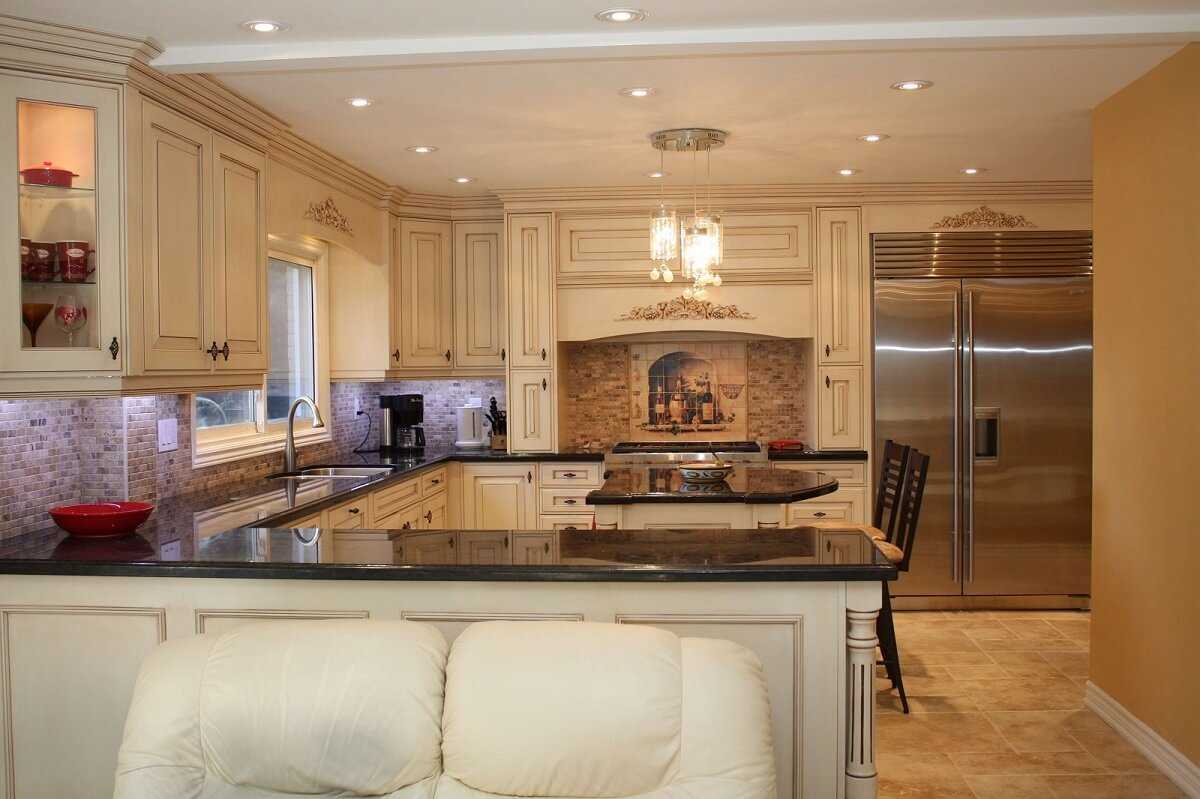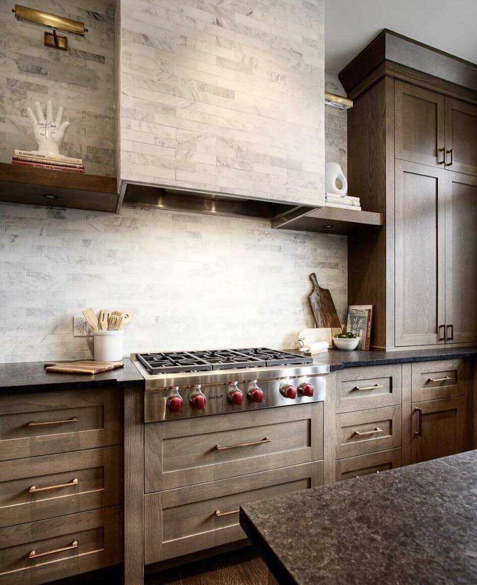 При создании классического стиля — с темно-коричневым, светло коричневым и белым, с серым и цветом кофе с молоком. Для отделки стен рекомендуется использовать более светлые тона, а темные оттенки могут присутствовать в кухонном гарнитуре и другой мебели.
