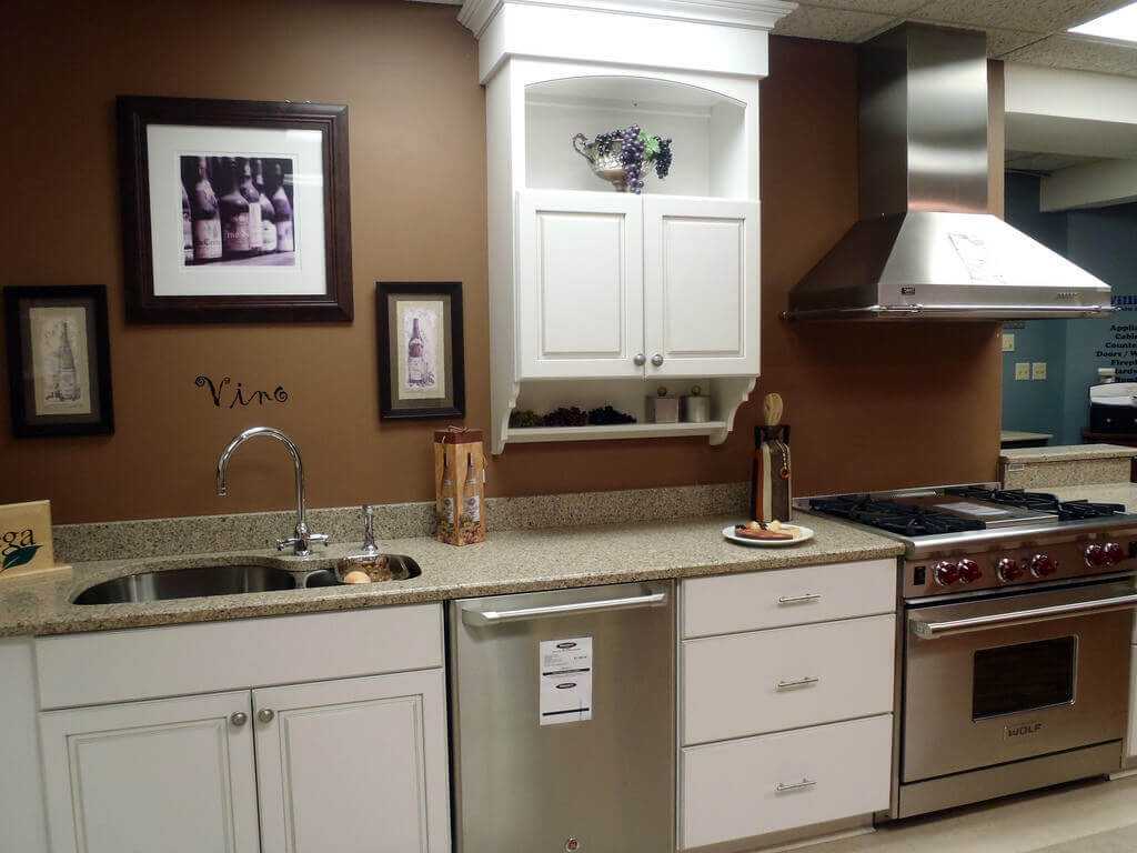 На фоне коричневых стен гарнитур любой окраски будет выглядеть презентабельно и гармонично.