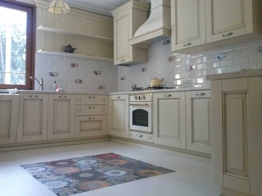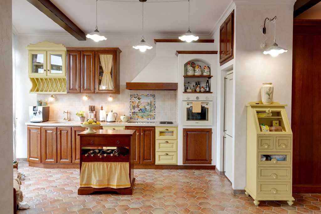 В качестве напольного покрытия лучше всего выбрать ламинат, кухонный гарнитур должен быть выполнен из дерева. Доминирующие цвета в таком интерьере можно выбирать по собственному усмотрению — это может быть светло-лавандовый, бежевый, бледно-желтый, цвет кофе с молоком, белый, светло-голубой и оливковый.