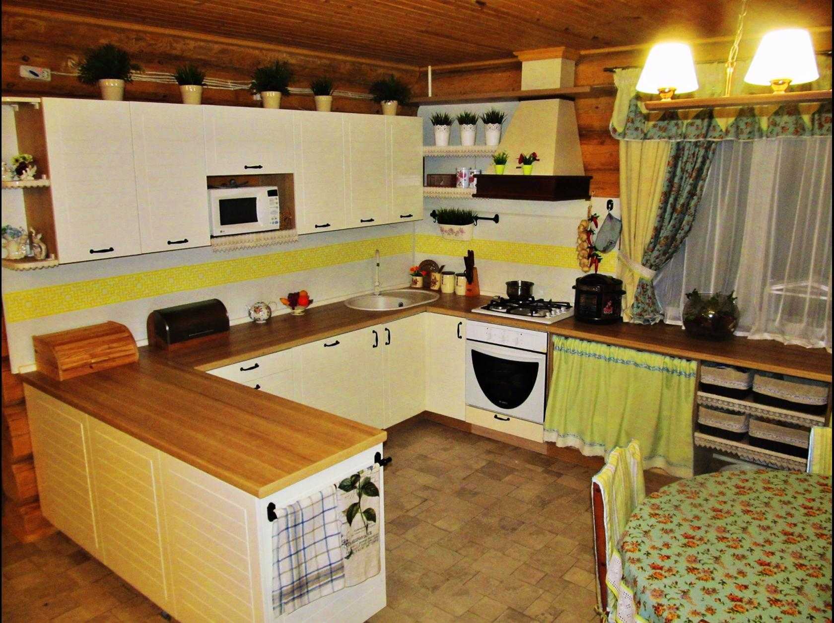 Деревенский прованс характеризуется мягкими кремовыми оттенками, которые присутствуют в окраске мебели из натурального дерева и фасаде кухни.