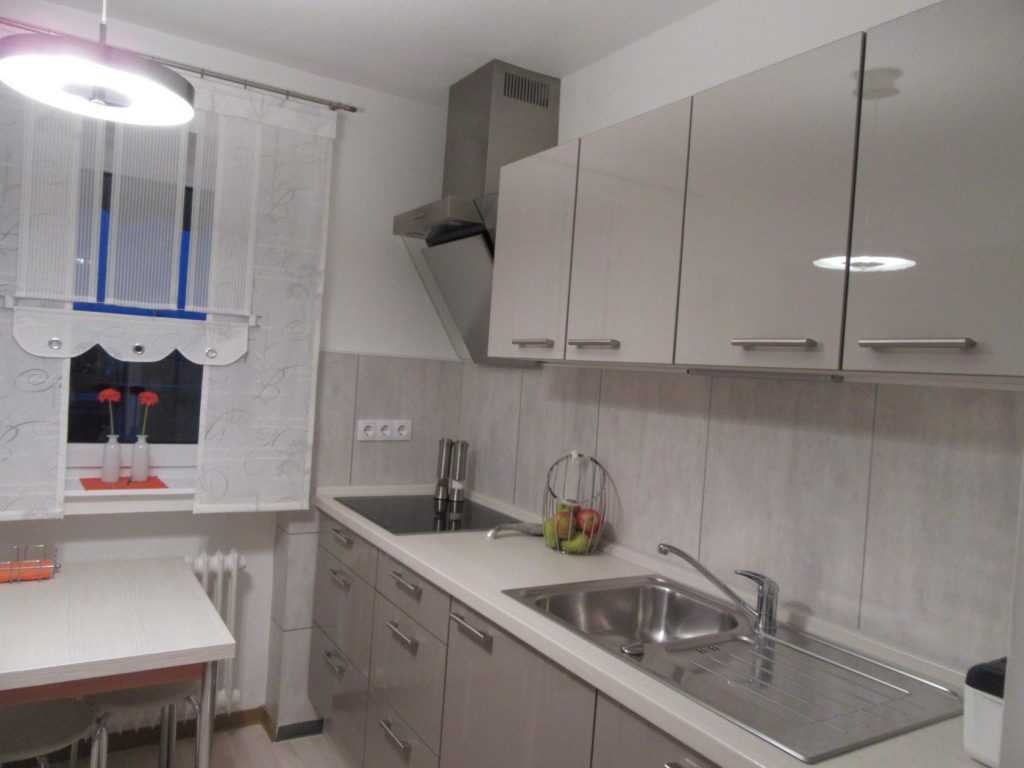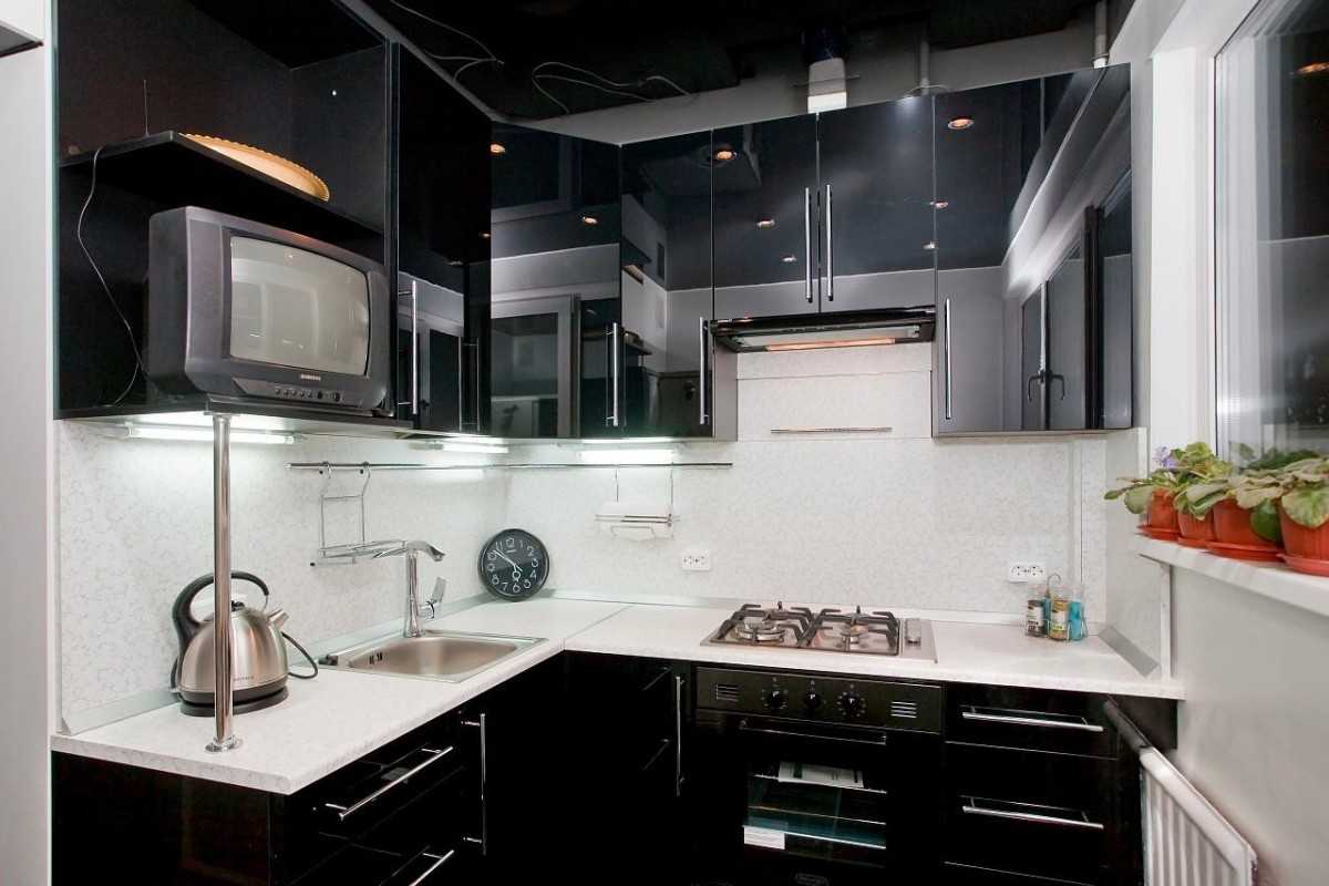 Для отделки стен лучше всего использовать штукатурку, краску либо моющиеся обои. Кухонный гарнитур необходимо выбирать современный, изготовленный из синтетических материалов (пластика, стекла, искусственного камня, металла). Пол стоит сделать светлым, для этого прекрасно подойдет ламинат.