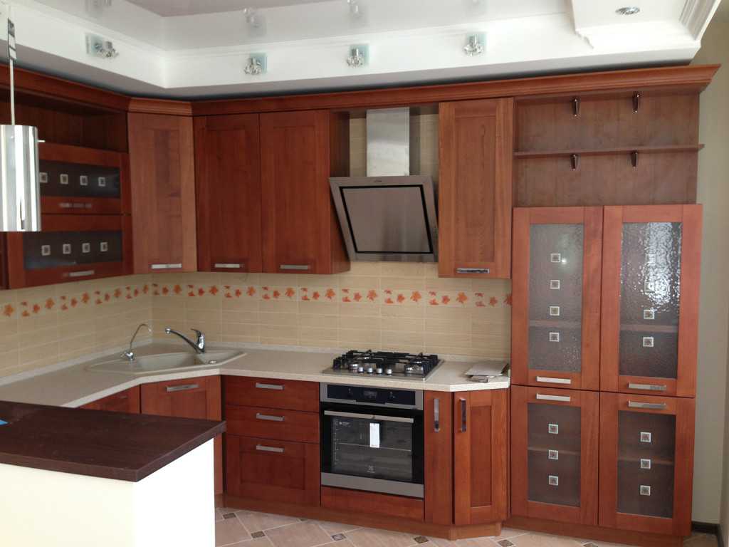 Интересно смотрится витражное или прозрачное стекло, вставленное в светлые деревянные рамки на фасаде кухни. Декоративные элементы должны перекликаться с мебелью.