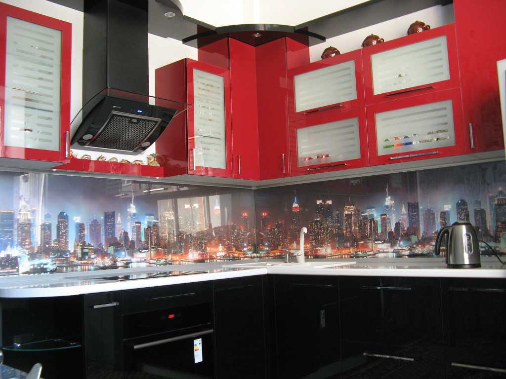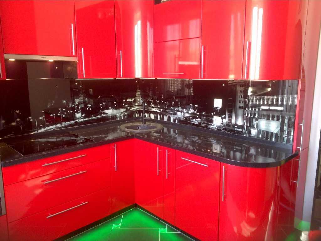 Красная кухня с черным фартуком — достойный вариант оформления помещения. Чтобы такой интерьер выглядел как можно интереснее, следует нижние и верхние фасады гарнитура выполнить в черно-красных тонах, разместив между ними черный фартук из закаленного стекла или керамической плитки.