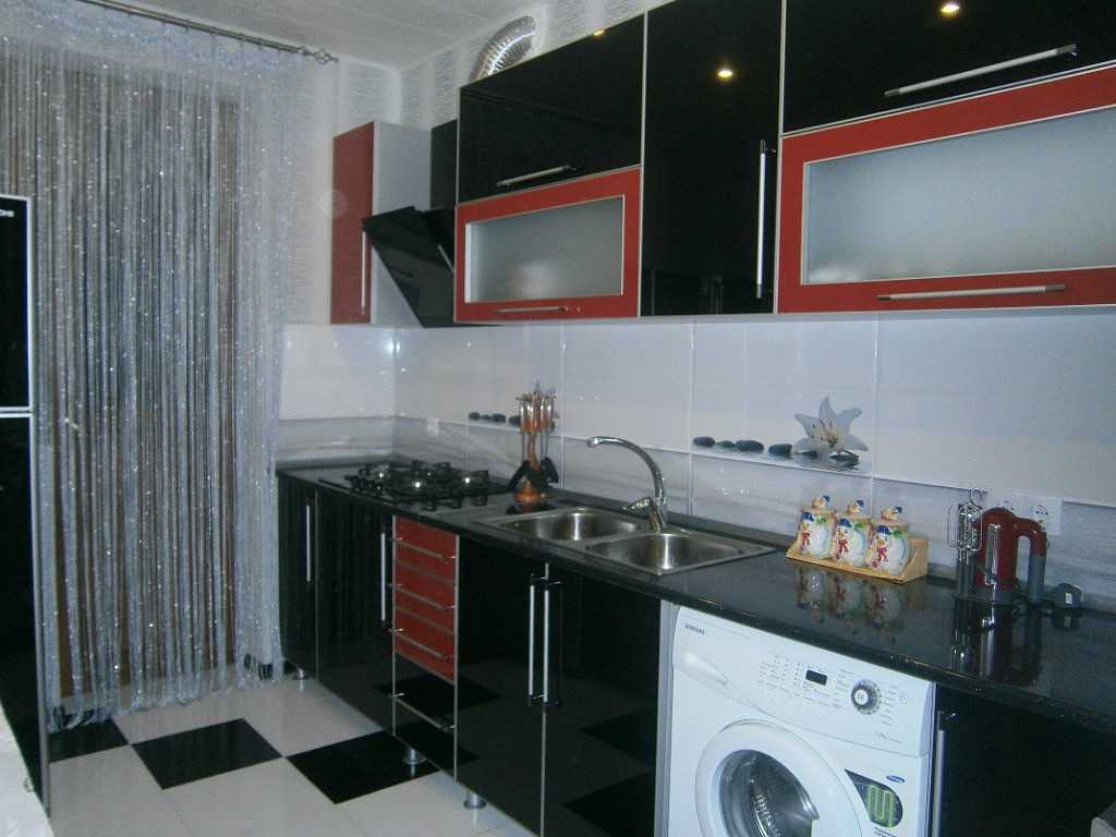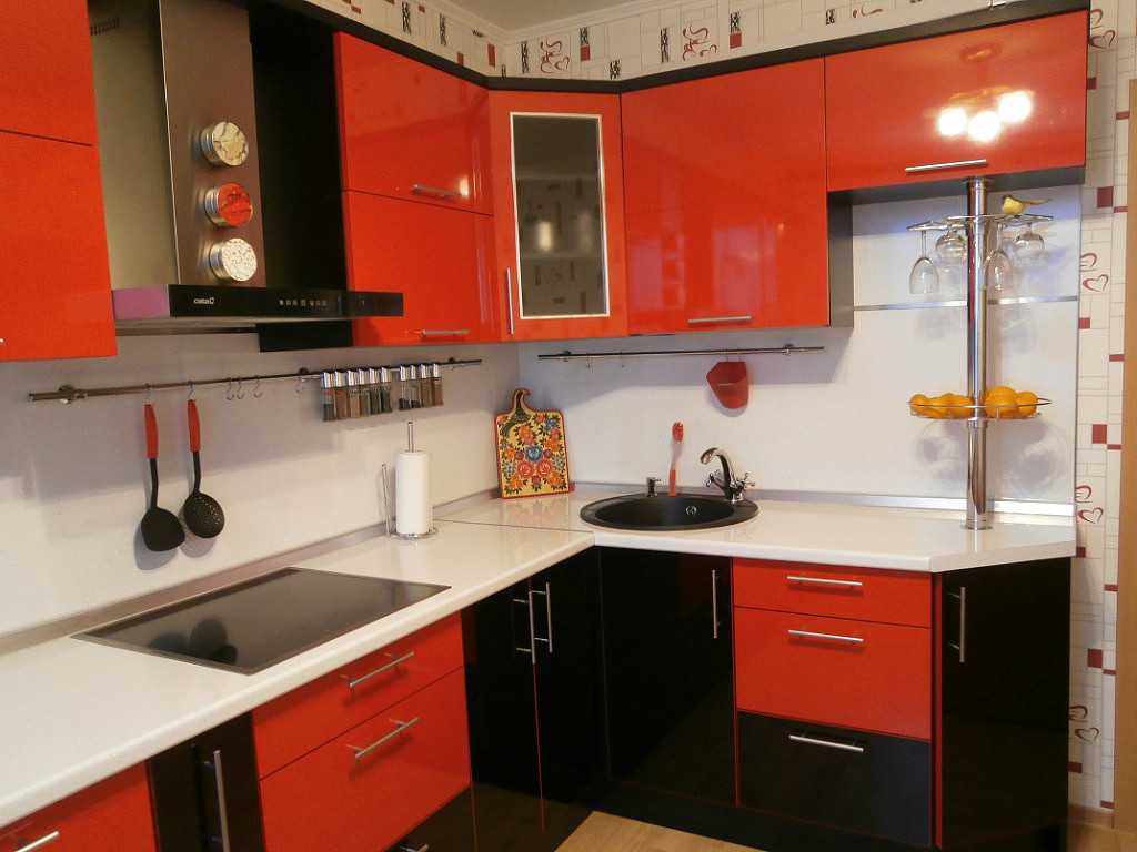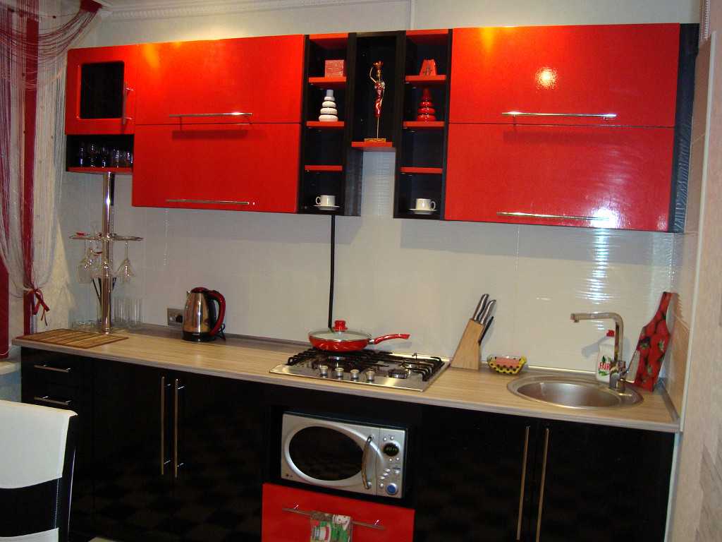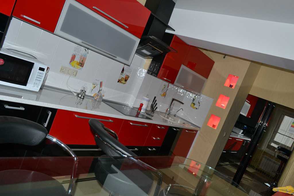 В красно-черных тонах следует сделать фасады гарнитура, а белый оттенок будет служить для них идеальным фоном. Что касается стиля интерьера, то он должен быть современным.