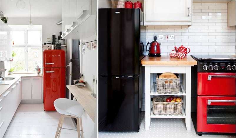 В красно-белый гарнитур удачно впишется техника черного или стального оттенка, но для любителей неожиданных решений в помещении, выполненном в светлых тонах, можно установить ярко-красный холодильник.