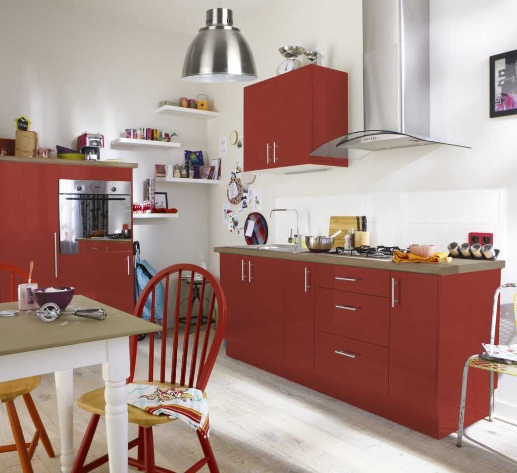 Также сбалансировать жар красного помогут глянцевые фасады, глазурованная плитка, стекло, хромированные и металлические поверхности.