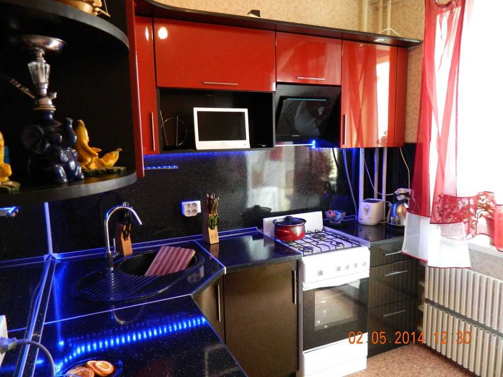 Например, обустроить фартук в черно-синих тонах, повесить на окна синие шторы, расставить на открытых полках декоративную посуду синего цвета.Красно-черный гарнитур необходимо дополнить черным обеденным столом с красными стульями. Стены лучше сделать серыми, пол может быть черным наливным.