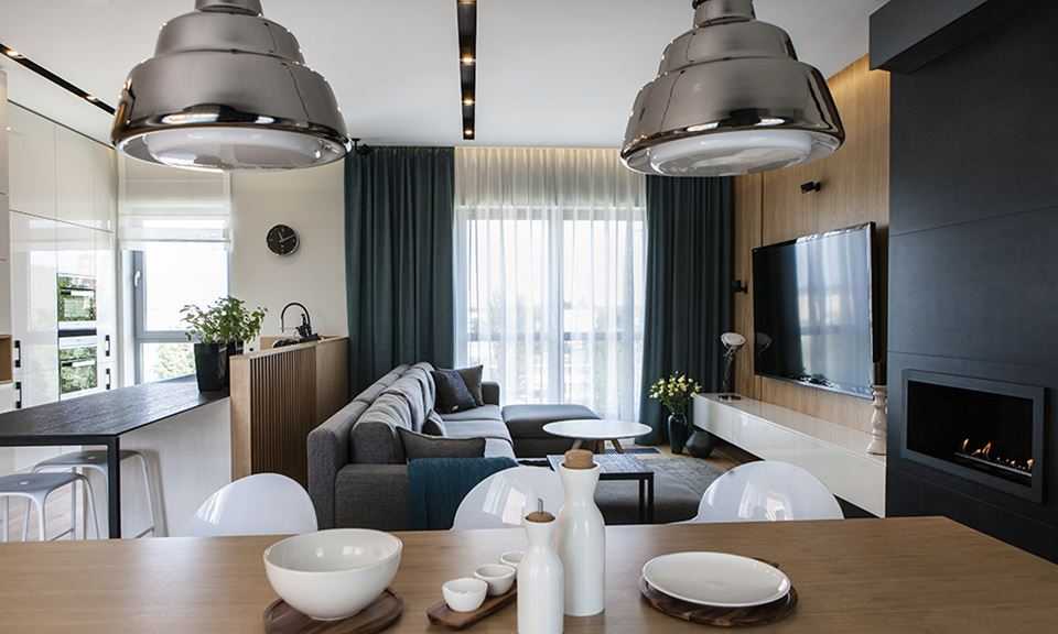 Необходимо позаботиться о качественном искусственном освещении пространства. В зоне кухни можно установить точечные потолочные светильники и дополнительно осветить рабочую столешницу. А над зоной для отдыха и принятия гостей подключить красивую люстру или подобрать напольный светильник. В таком случае появится возможность также визуально разделить пространство светом, включив свет лишь в одной функциональной зоне.