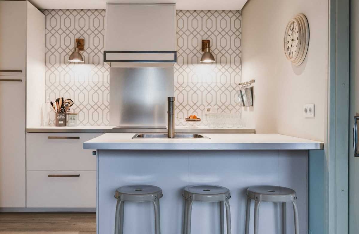 Чтобы помещение не выглядело мрачным, в интерьер была внесена нотка свежести, синий цвет стоит применять только в акцентах. Например, синей могут быть обивка, занавески, скатерть, часть гарнитура, обои одной из стен. Дизайнеры отмечают, что, если покрасить либо обклеить одну из стен синим цветом, зрительно она отдалится. Это сделает кухню просторнее.
