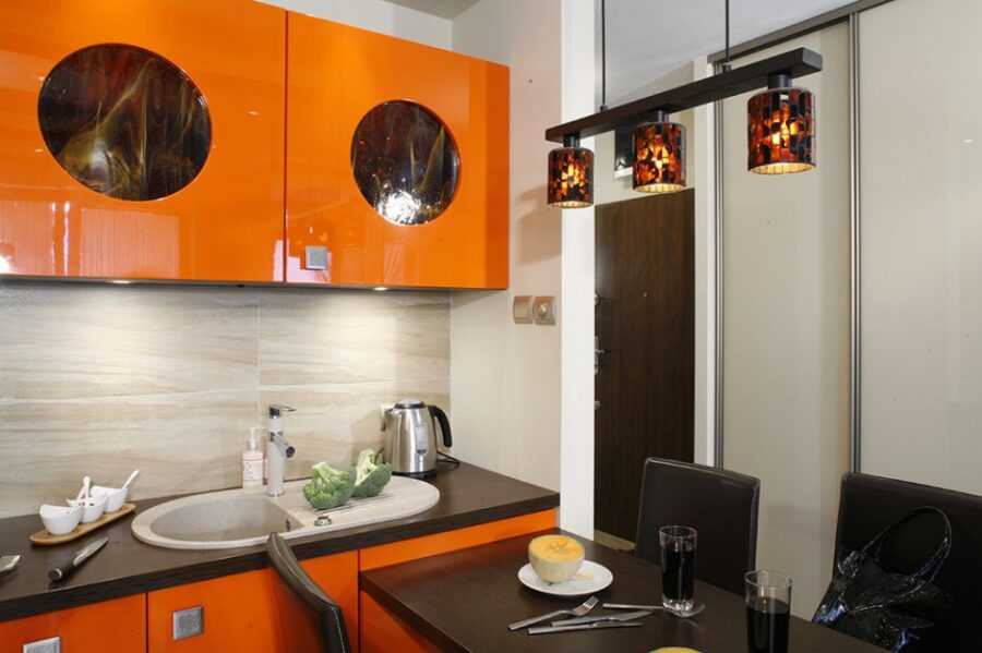 Если вы выбрали апельсиновый интерьер кухни, он потребует большого количества естественного и искусственного света. Только в этом случае цвет заиграет яркими красками и будет выглядеть жизнерадостно. Наиболее оптимальный вариант электрического освещения это точечные светильники, расположенные во всех зонах кухни. Глянцевые поверхности только усилят эффект, отражая свет.