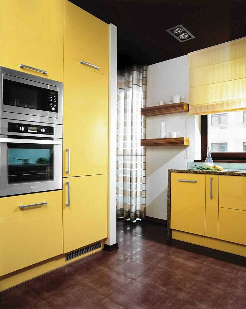 Желтая кухня в сочетании с коричневымИсточник obzorkuhni.ru/
