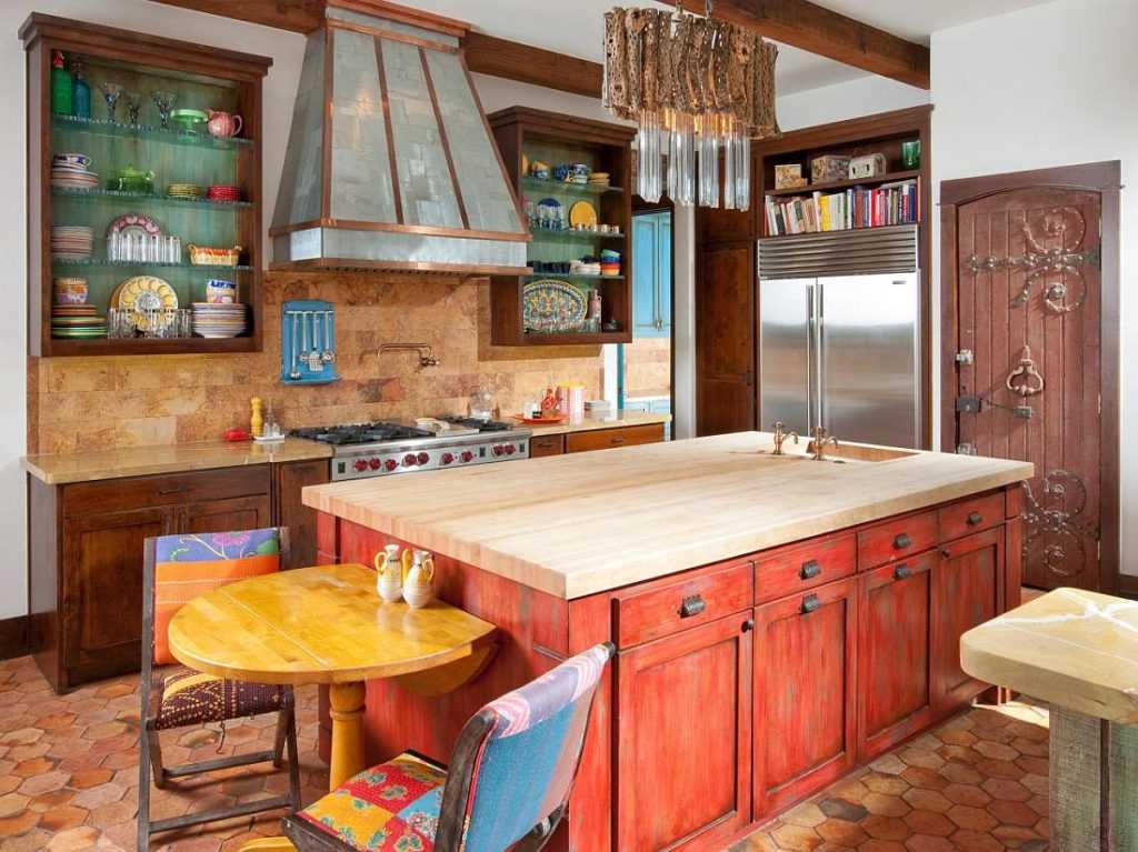 Оранжевая мебель гармонично вписывается в средиземноморский интерьер. Кухню дополняют легкая обеденная зона из дерева и прозрачные занавески. Вместо стульев используют плетеные кресла из ротанга, на пол укладывают узорчатую керамическую плитку. Для средиземноморского стиля характерно много света, волнистых орнаментов, предметов декора. Зачастую апельсиновую кухню дополняют синими или голубыми фасадами. Стены оклеивают яркими обоями или наносят фактурную декоративную штукатурку.