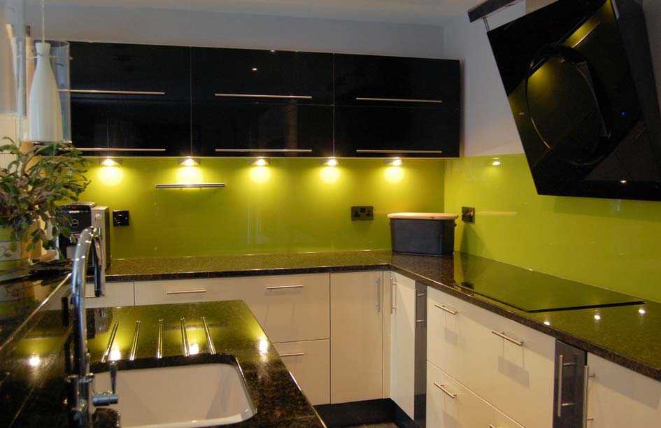 Совет! Зеленый фартук можно делать и вместе с зеленым гарнитуром. При этом недопустимо использовать один тон. В этом случае как раз отлично подойдет стекло с фотопечатью.