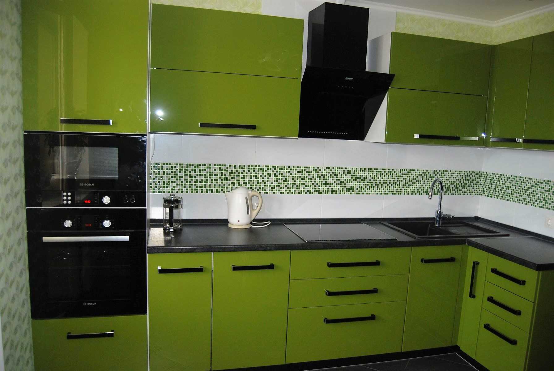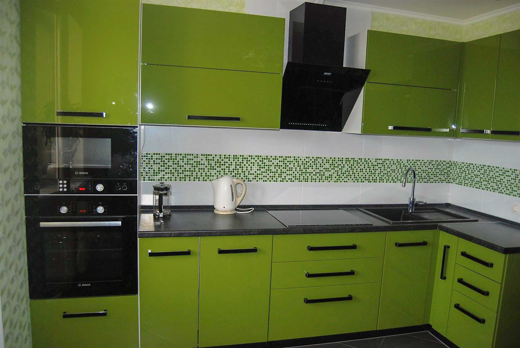 А вот для помещения в стиле модерн подойдет кухонный гарнитур олива с пластиковым фасадом.