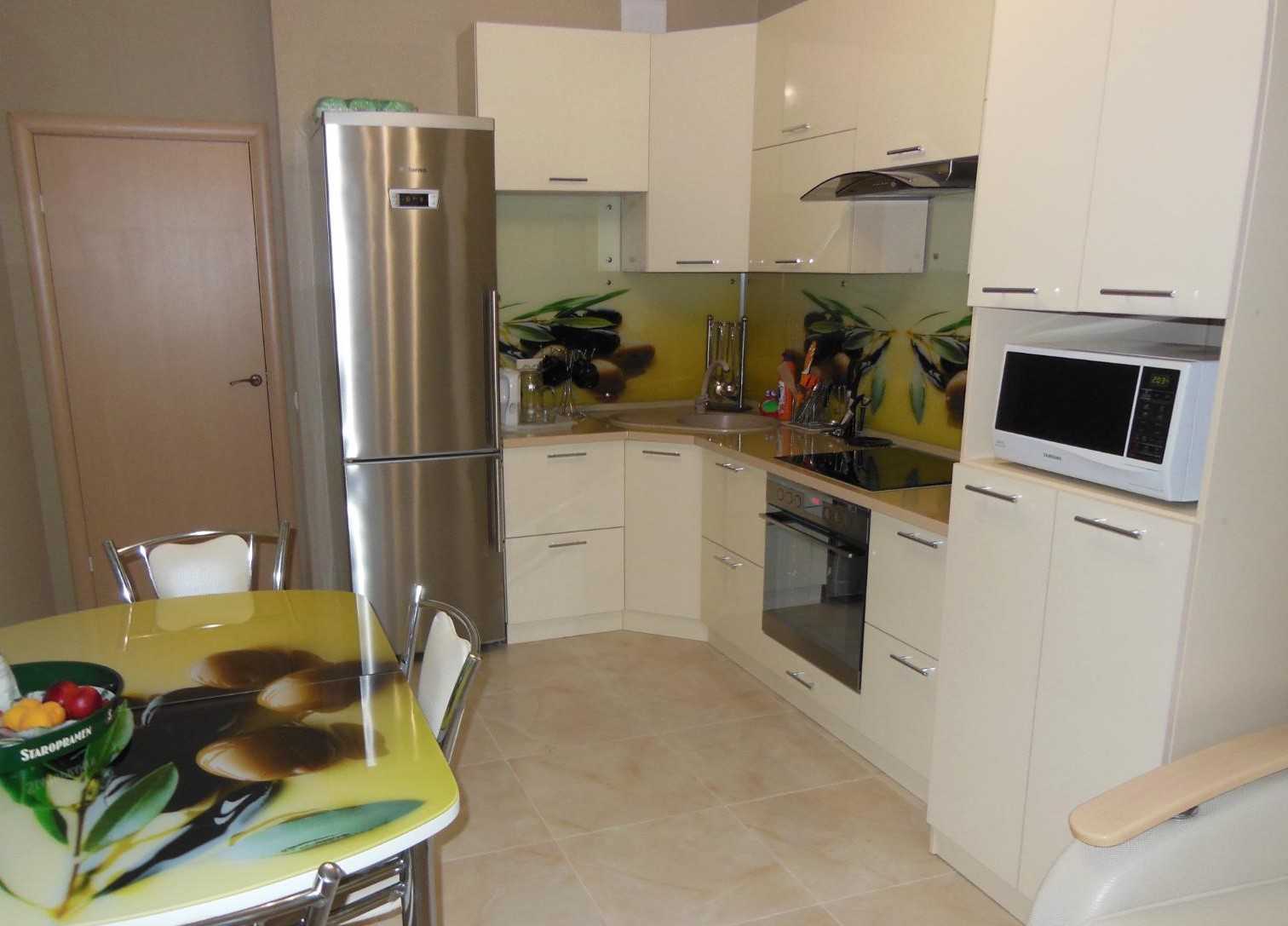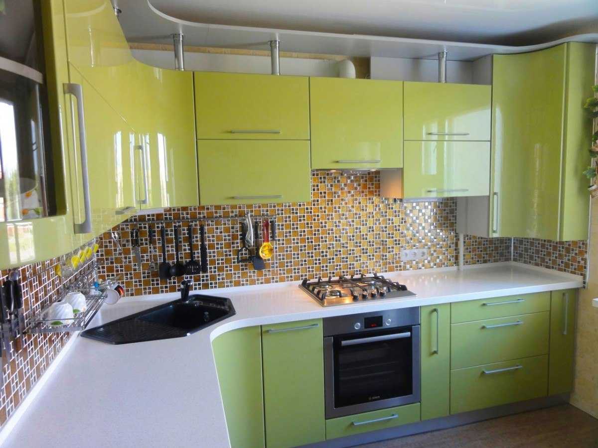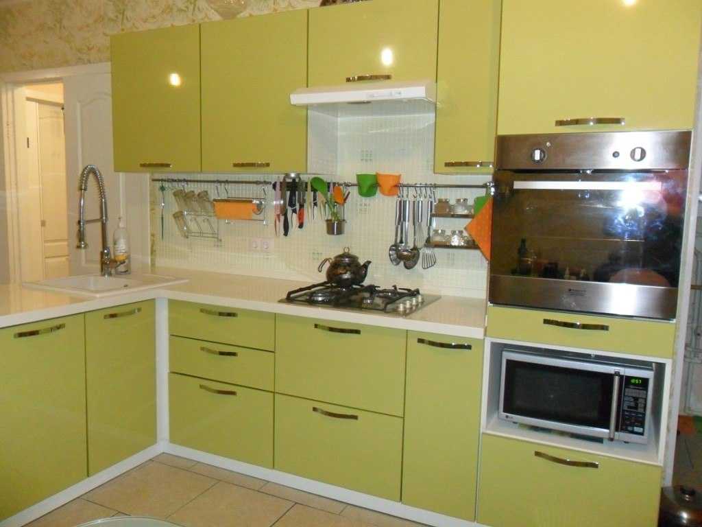 Выбирая такую мебель для кухни, можно немного поиграть с цветовой палитрой. Интересно будет выглядеть гарнитур с фасадами оливковых оттенков, сочетающимися с кухонным фартуком желтого цвета и светлыми столешницами.