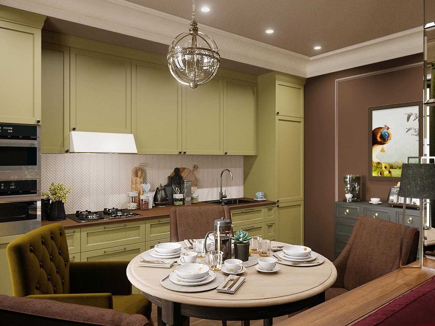 Классический стиль остается неизменно популярным. Благородные оттенки и плавные линии украсят интерьер любого помещения. Оливковый цвет идеально подойдёт для классического направления, дополнение из мебели изящной формы и натуральные ткани поддержат общую концепцию интерьера. Гармоничным будет сочетание фисташкового и бежевого или шоколадного.