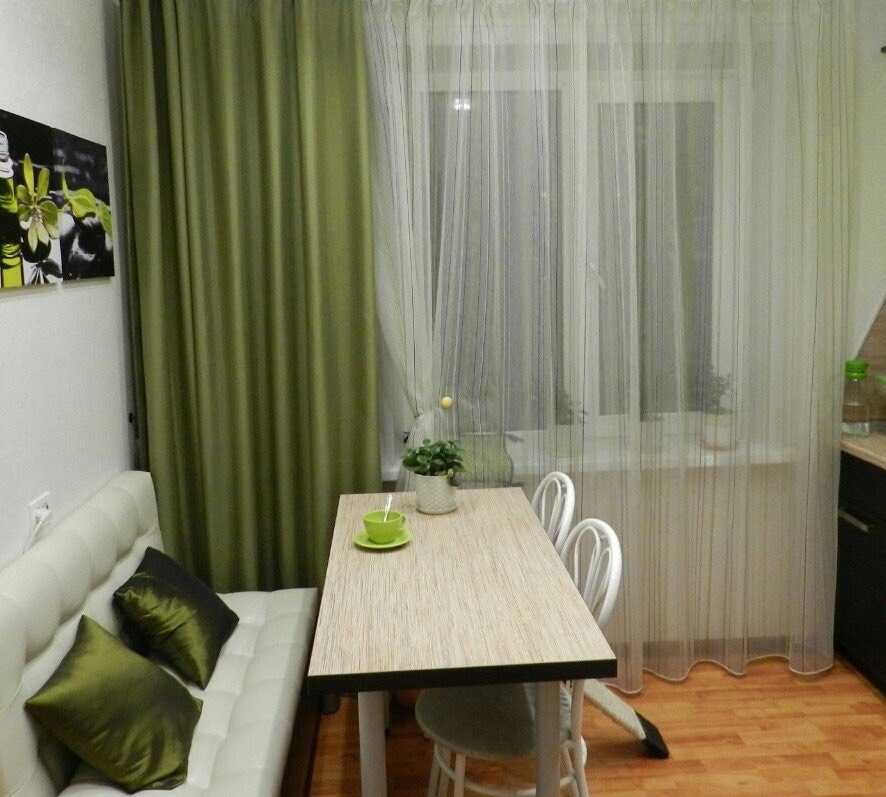 Отличным дополнением станут шторы из серебристой ткани. Раковину и бытовую технику лучше подобрать серую или цвета металлик. В оливковом можно оформить кухонный фартук, текстиль, обеденный стол и стулья. Напольное покрытие лучше сделать серым.