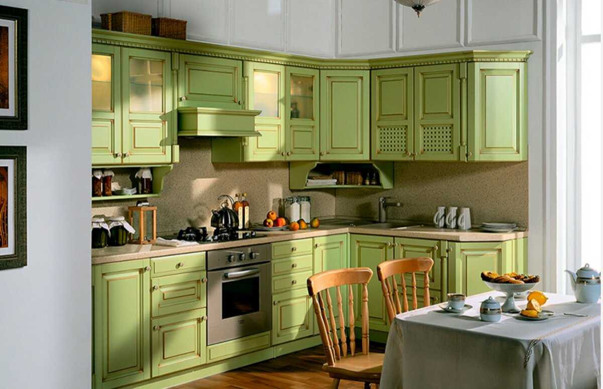 Добавить интерьеру немного шарма поможет оригинальный растительный орнамент, выполненный поверх оливковых фасадов. Если интерьер классический, гарнитур должен быть выполнен из массива дерева, ДСП или МДФ.