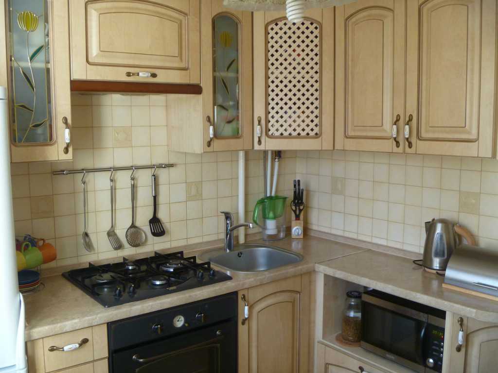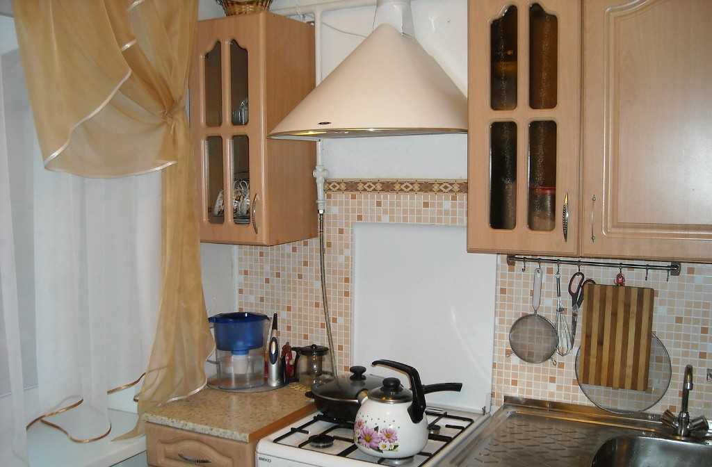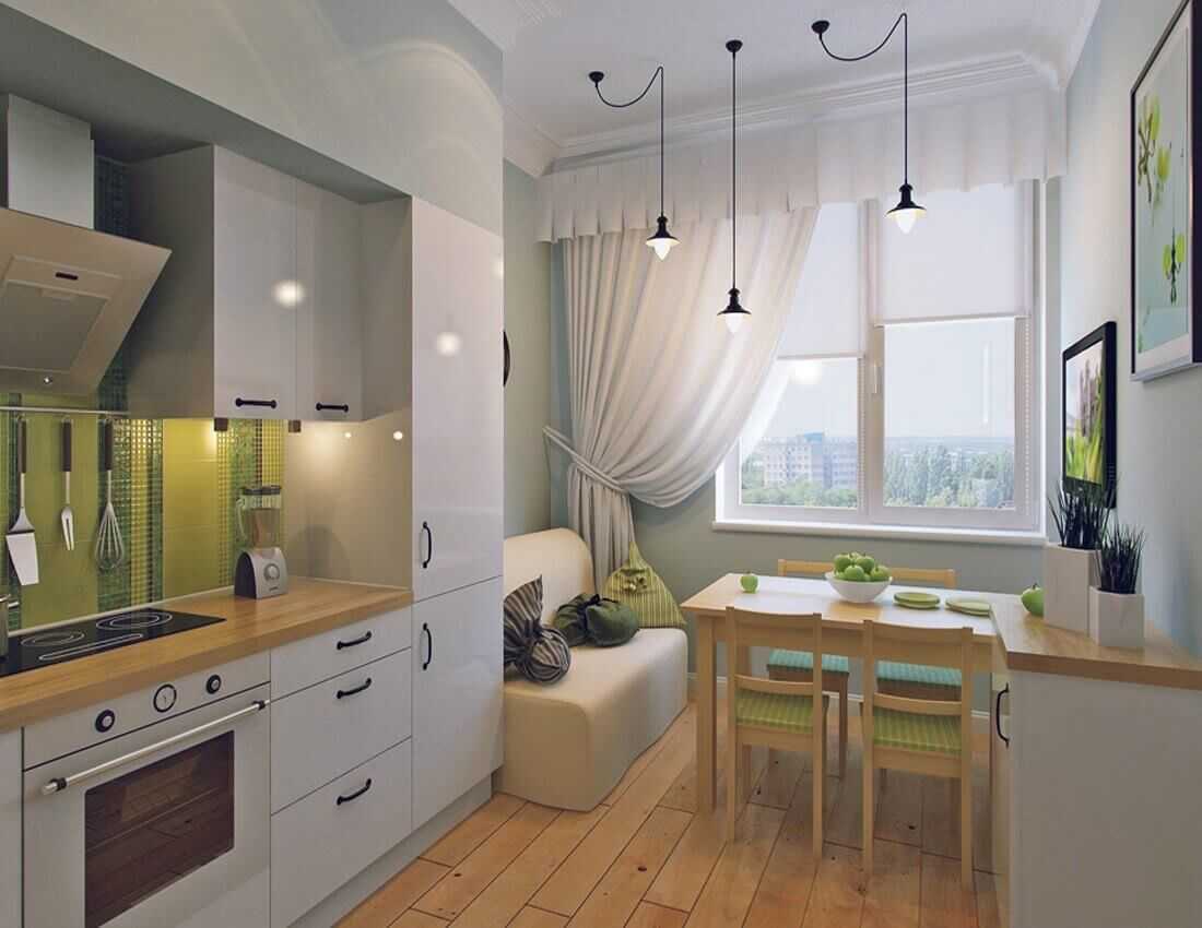 Для визуального увеличения кухни рекомендуют использовать бледные тона при оформлении, на окнах повесить белые жалюзи или бежевый прозрачный тюль. Это поможет сконцентрировать естественный свет в помещении, расширив его.