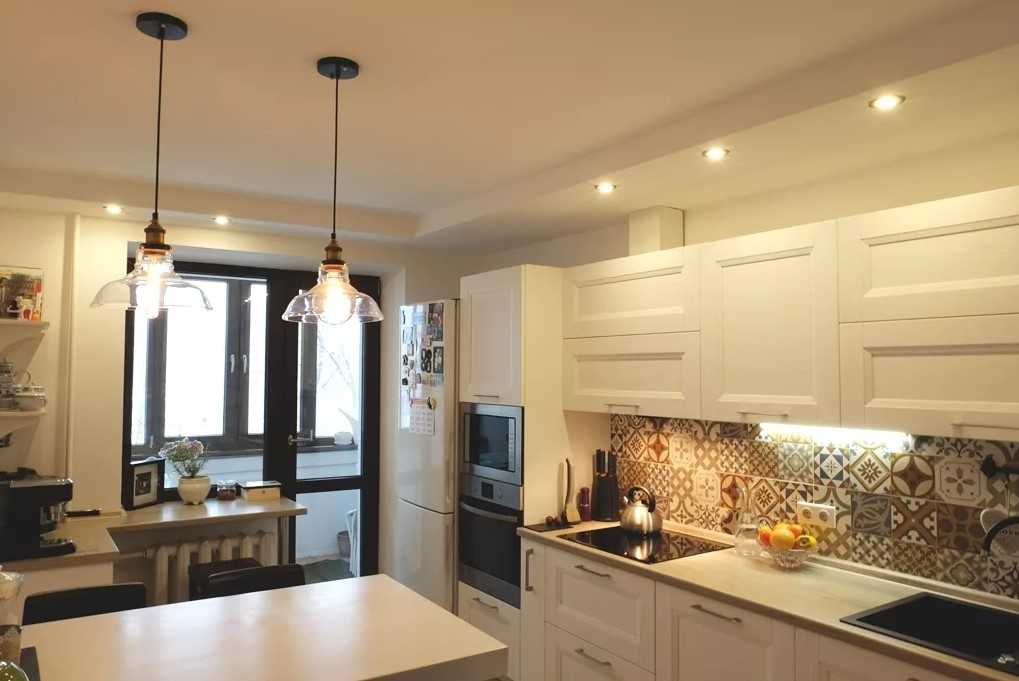 Эксперты советуют установить многоуровневый свет, который подсвечивает каждую зону отдельно. Для подсветки рабочих поверхностей используют поворотные плафоны или встроенные в потолок конструкции. С ними легко мыть посуду или готовить еду в темное время суток. Для освещения обеденного стола применяют напольный торшер, настольный светильник или уютный парный бра.