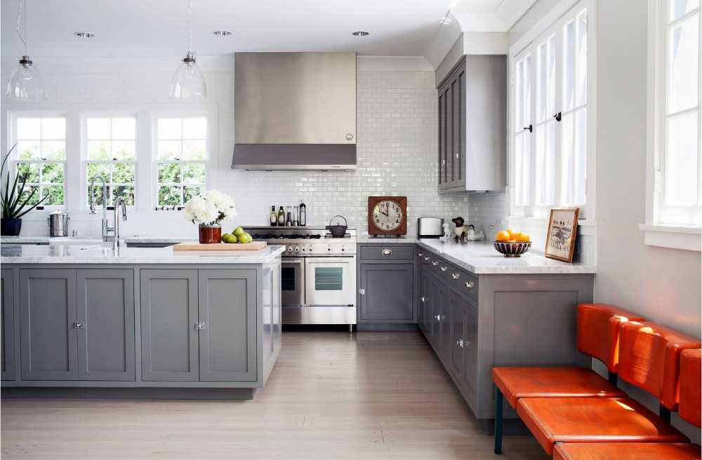 Серый пол – оптимальный вариант, используемый многими. Он замечательно подойдет под любой стиль и цветовую гамму. Серый настолько нейтрален, что сможет органично вписаться в новое оформление, если вам даже захочется полностью изменить палитру кухни. Он внесет необходимый баланс в яркий интерьер и выгодно подчеркнет интересные дизайнерские решения.