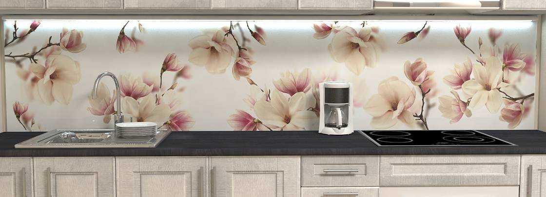 - Оргстекло – точнее говоря, панели из акрила и поликарбоната. Фотопечать на них обладает теми же достоинствами, а вот сам материал несколько отличается. Превосходя силикатное стекло по прочности и безопасности, пластик проявляет склонность к деформации при нагреве. Такой вариант рекомендуется для кухонь с электрической плитой либо индукционной варочной поверхностью. На фото ниже – акриловые панели с фотопечатью на кухне.