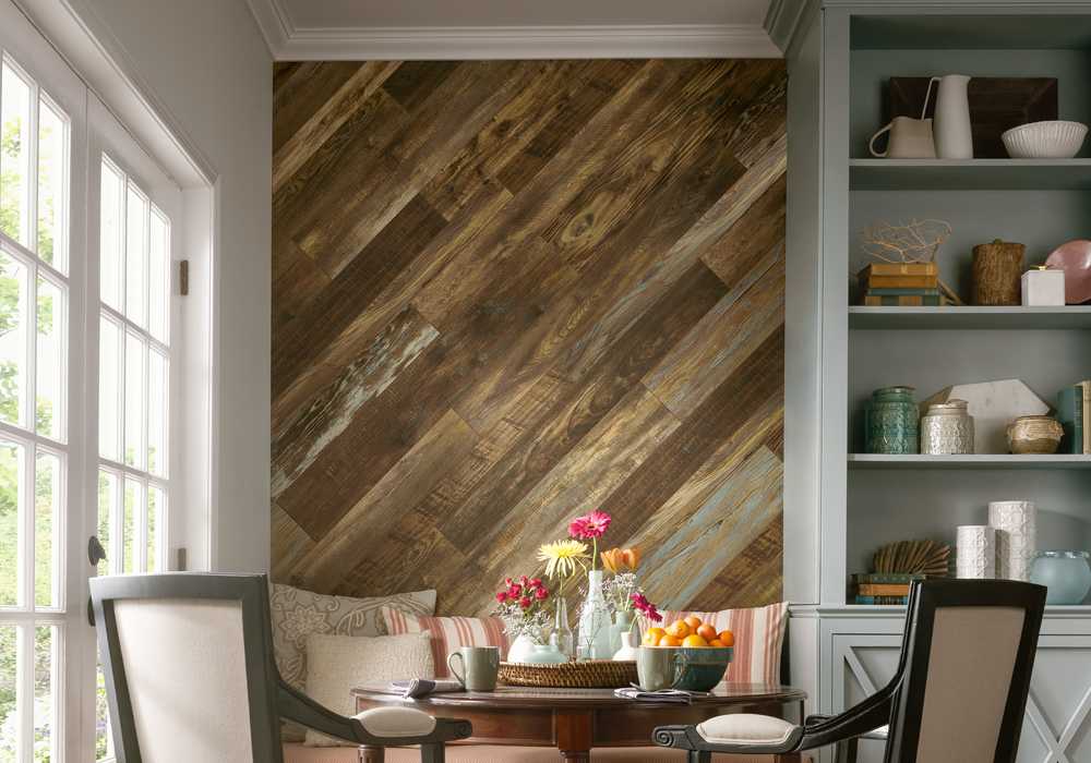 Еще один пример комплексной отделки большой стен. Сбалансированное сочетание цветов, позволяет создать целостный интерьер. А использование ламината разного размера делает поверхность неоднородной, придает ей объем.