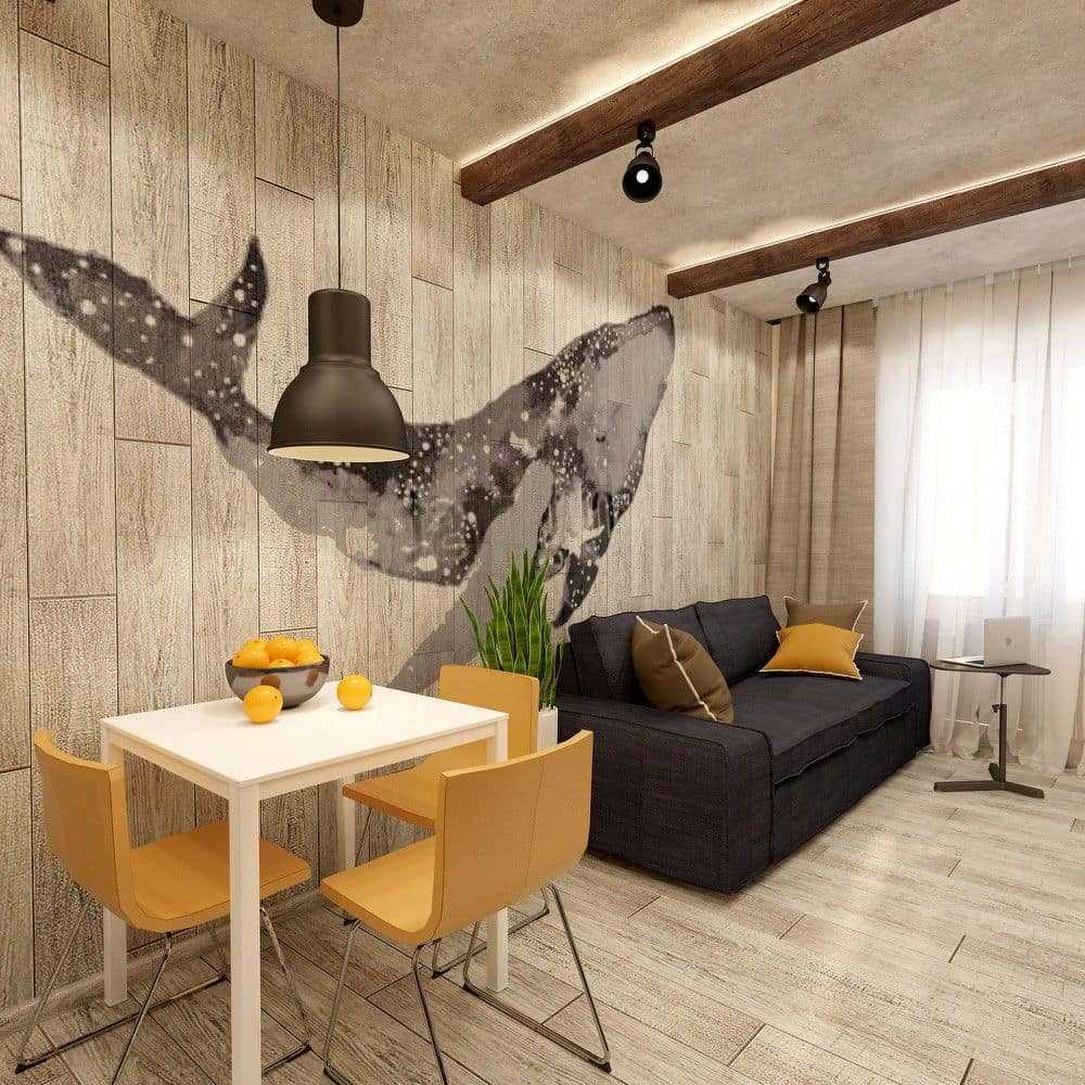 - Ламинатом темного цвета отделывают стену, вдоль которой расположится зона приема пищи.