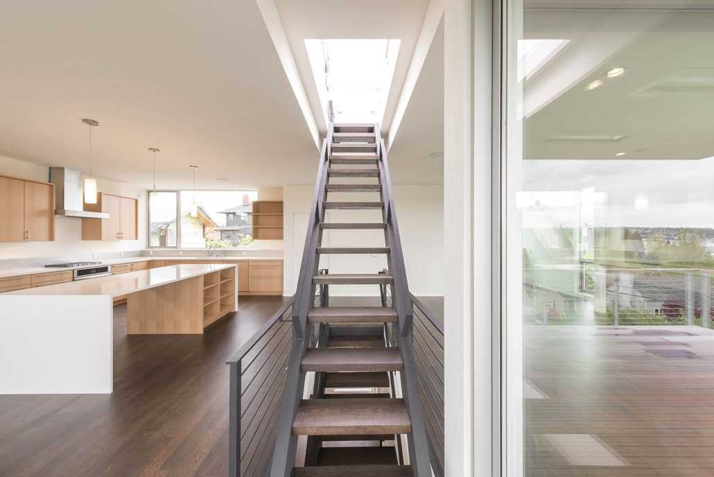 Также лестничную конструкцию можно установить посередине гостиной, чтобы разделить помещение на зоны. Данный вариант отлично впишется в комнату, которую нужно зрительно разделить на столовую и место отдыха.