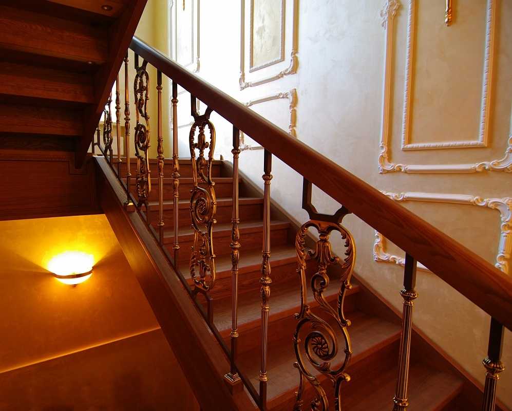 В классическом стиле желательно чтобы использовались следующие материалы – декоративный камень, металл и древесина, последний в этом перечне лидирует. Лестница в таком стиле отличается массивностью, поэтому её сооружают в больших помещениях.