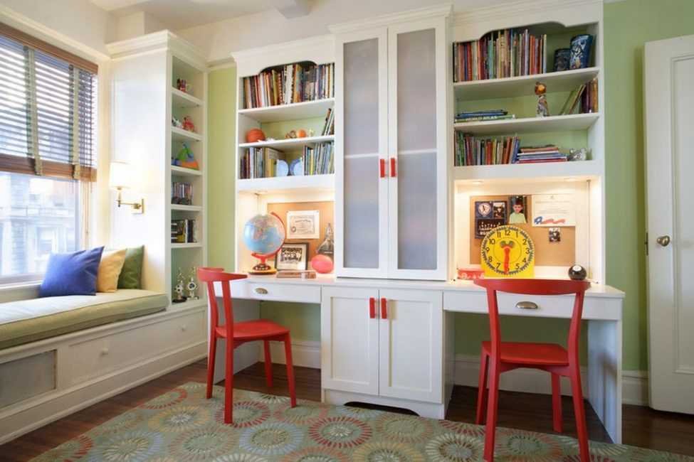 У школьников должен удобный письменный или компьютерный стол. Для каждого ребенка отделяют свою часть стола, а его личная зона оборудуется полками и выдвижными ящиками на расстоянии вытянутой руки. Обязательно хорошее (но не очень яркое), локальное освещение там, где дети учат уроки или сидят за компьютером