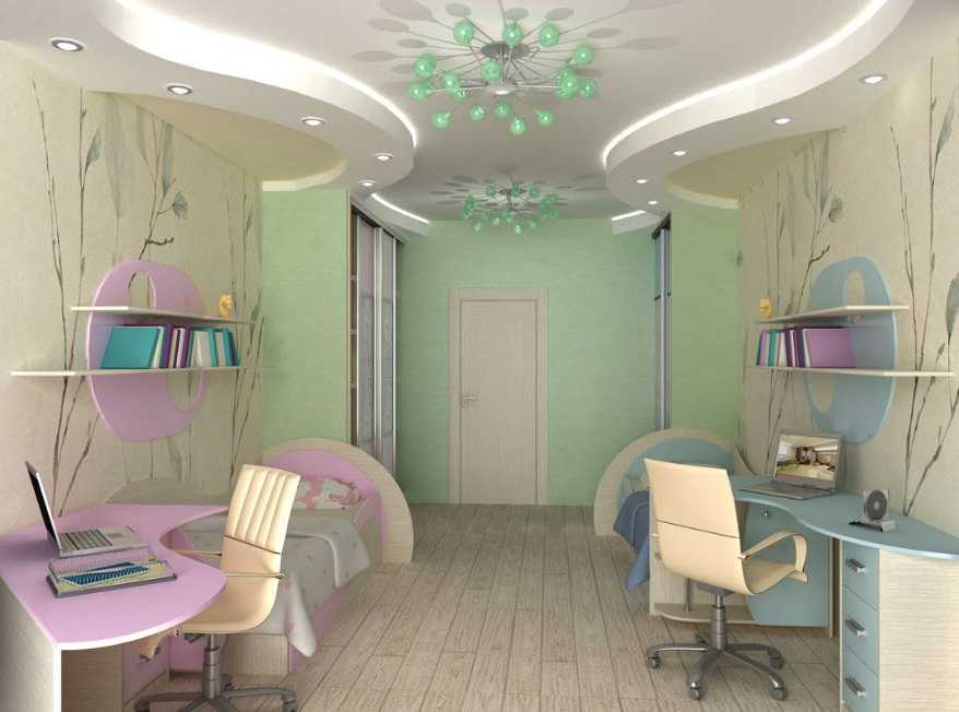 Это могут быть ниши либо, наоборот, выступы, рабочие зоны над письменными столами. Неплохим приемом будет выделение игровой зоны, объединяющей комнату. Если кровати находятся рядом, можно обозначить обоями с принтом именно их. Можно оформить контрастными обоями выступ с переходом на потолок. Можно обозначить особенности планировки разным цветом, используя разные однотонные обои одинаковой фактуры. Хорошими цветами для двух полов будут светлые оттенки зеленого, светло-серый, бежевый, теплый голубой и светлый коричневый цвета.