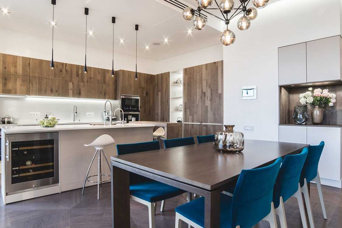 Разграничить нужные участки можно с помощью источников света. Поместите над зоной отдыха 1-2 лампы, которые дадут много освещения, а рабочую площадь обозначьте по периметру точечными потолочными светильниками. Также зону для работы можно подчеркнуть, выделив фартук, либо контрастным цветом, либо отделочным иным материалом.