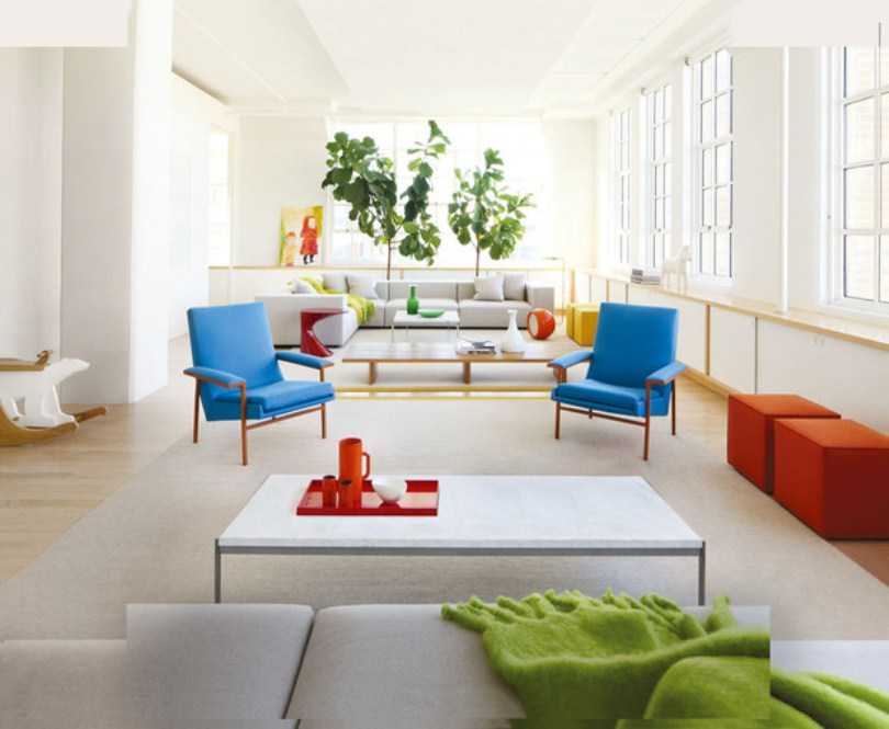 - Стены светлых природных оттенков (белого, песочного, светло-коричневого, бледно-зеленого, молочного светло-серого) зрительно раздвинут помещение. Яркие цветовые акценты оранжевого, терракотового, горчичного, коричневого в декоре обивочных тканей добавят уюта, главное, не перегрузить интерьер избыточной пестротой.