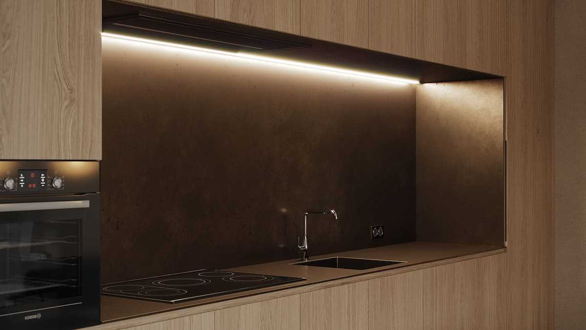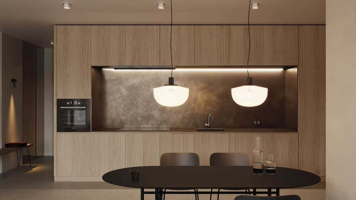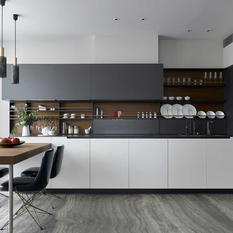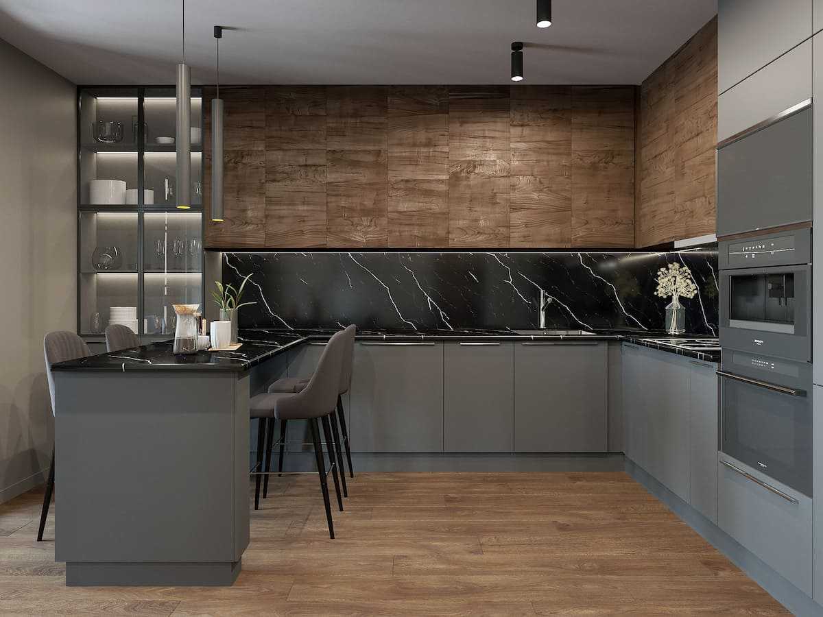 Для больших кухонь подойдут приглушенные цветовые решения, столешницы из мрамора или дерева.