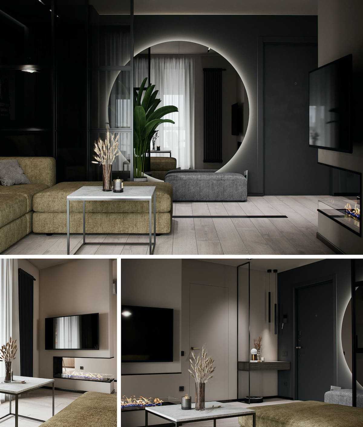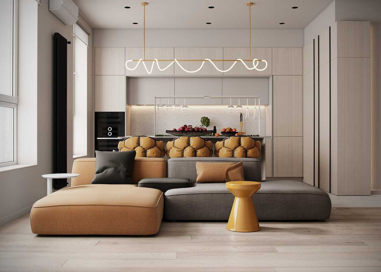 Разделить квартиру или комнату на функциональные зоны поможет и правильное освещение. Сейчас практически не используется одно центральное освещение в виде большой люстры, все чаще можно встретить точечные светильники, настенные и напольные светильники. Также создает приятную атмосферу мебель с интегрированной подсветкой, что выделяет ту или иную мебель из общей картины. Чем богаче освещение, тем просторнее комната визуально, что особенно актуально на небольших площадях.