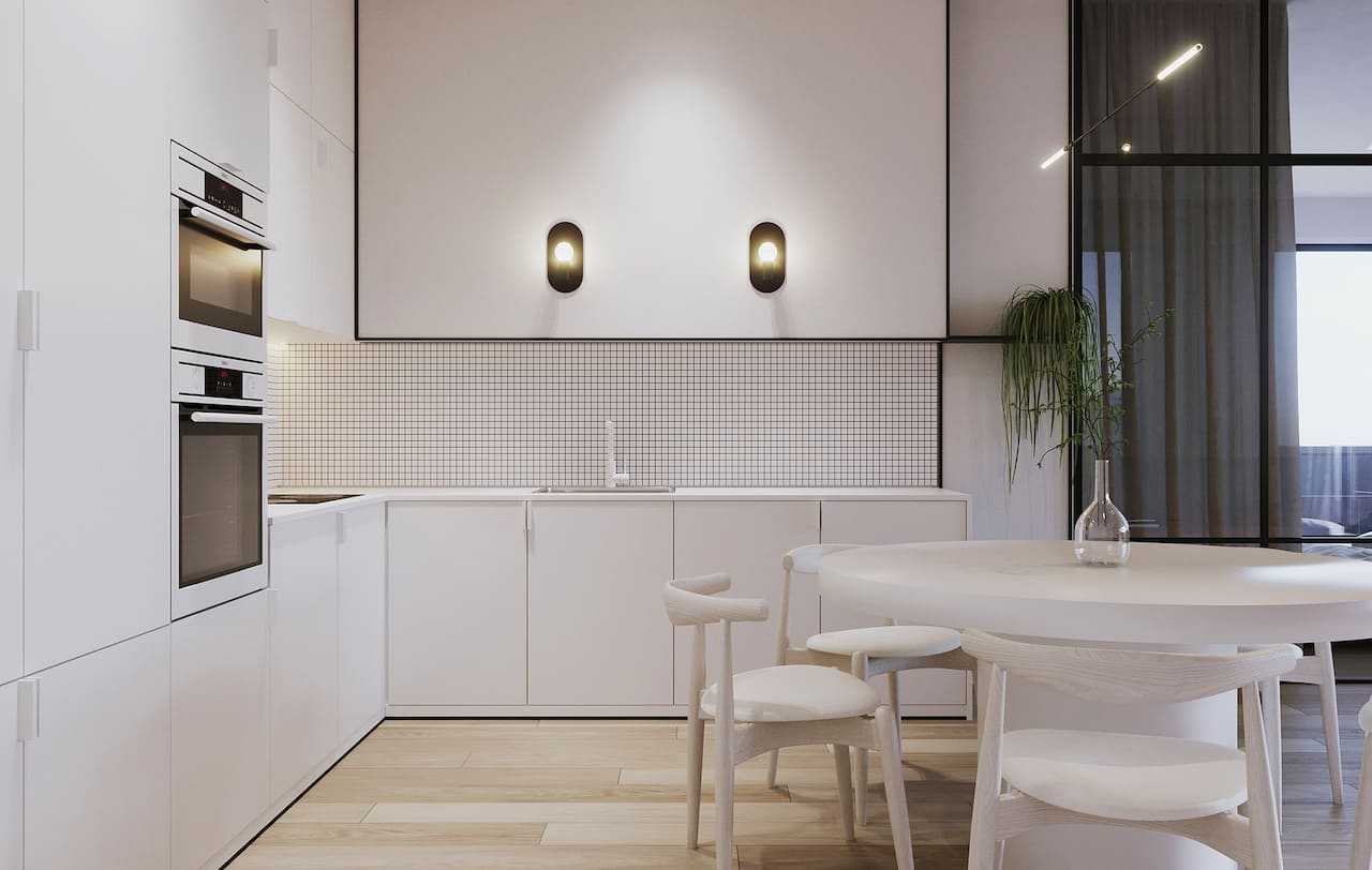 Для небольшой кухни стоит выбирать гарнитур белоснежного цвета. А обрамленное окно впустит в кухню солнечный свет, визуальным образом увеличивая ее простор.