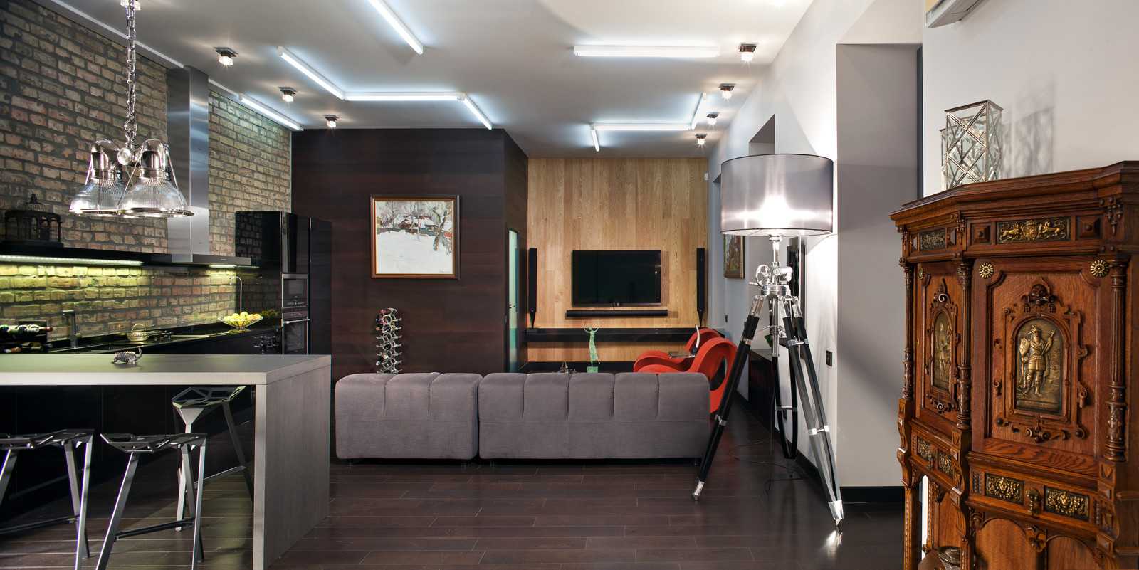 Очень хороший эффект даёт сочетание старинной и современной мебели, современных осветительных приборов и антикварных предметов декора. Очень интересный результат получается, если оформить потолок ультрамодными точечными светильниками, которые зонируют пространство и традиционной хрустальной люстрой.