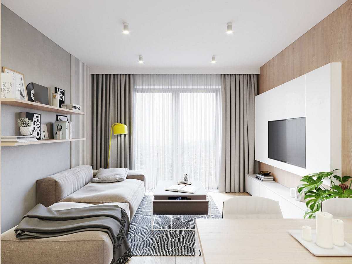 Однако иногда гостиная имеет неправильную форму – она может быть вытянутой от окна до дверного полотна, что не всегда позволяет организовать и использовать все пространство полностью.